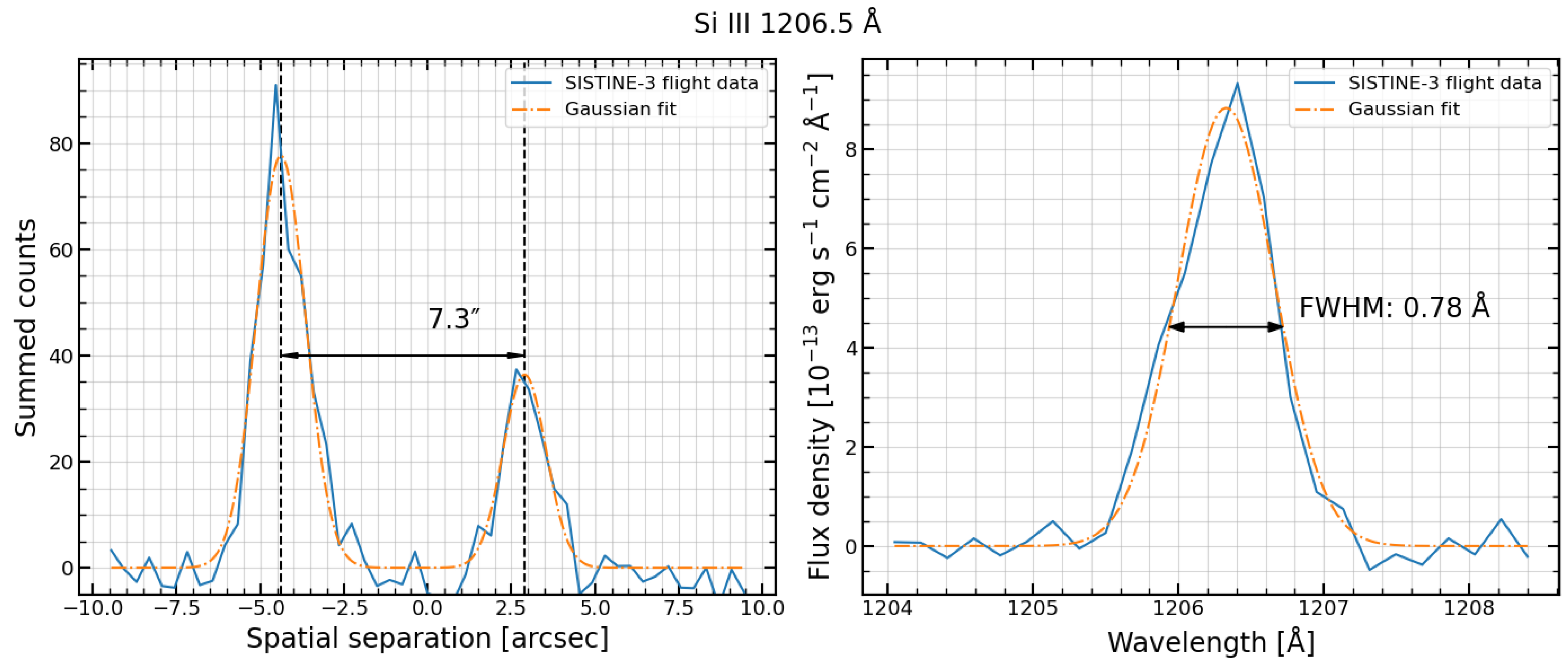 Spatial and spectral resolution of SISTINE-3 calculated using the Si III line at 1206.5 Å. Left: Si III lines of α Cen A and B. The larger emission line is from A and the smaller is from B. The lines are separated by ∼7″, which matches the predicted on-sky separation of the stars. Right: Si III emission of α Cen A.