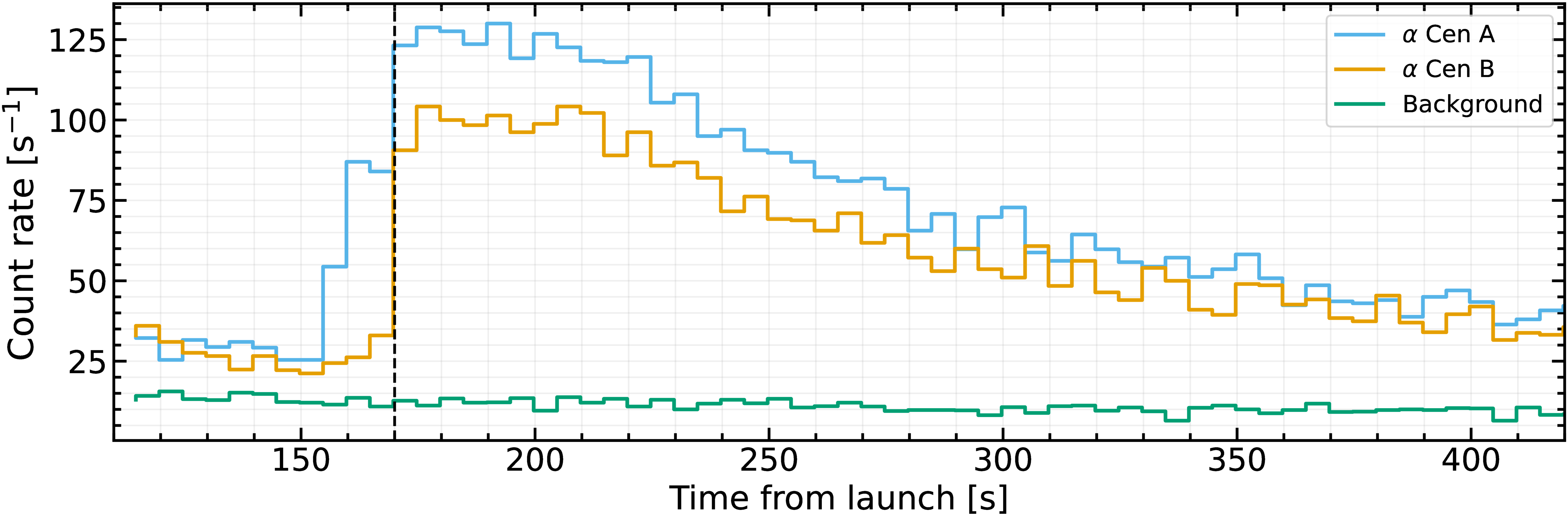 In-flight light curves from SISTINE-3. Data have been binned to 5 s intervals. The vertical black line shows when the payload reached its final pointing location. The count rate decreases over the duration of the flight due to the target drifting within the slit during observation.