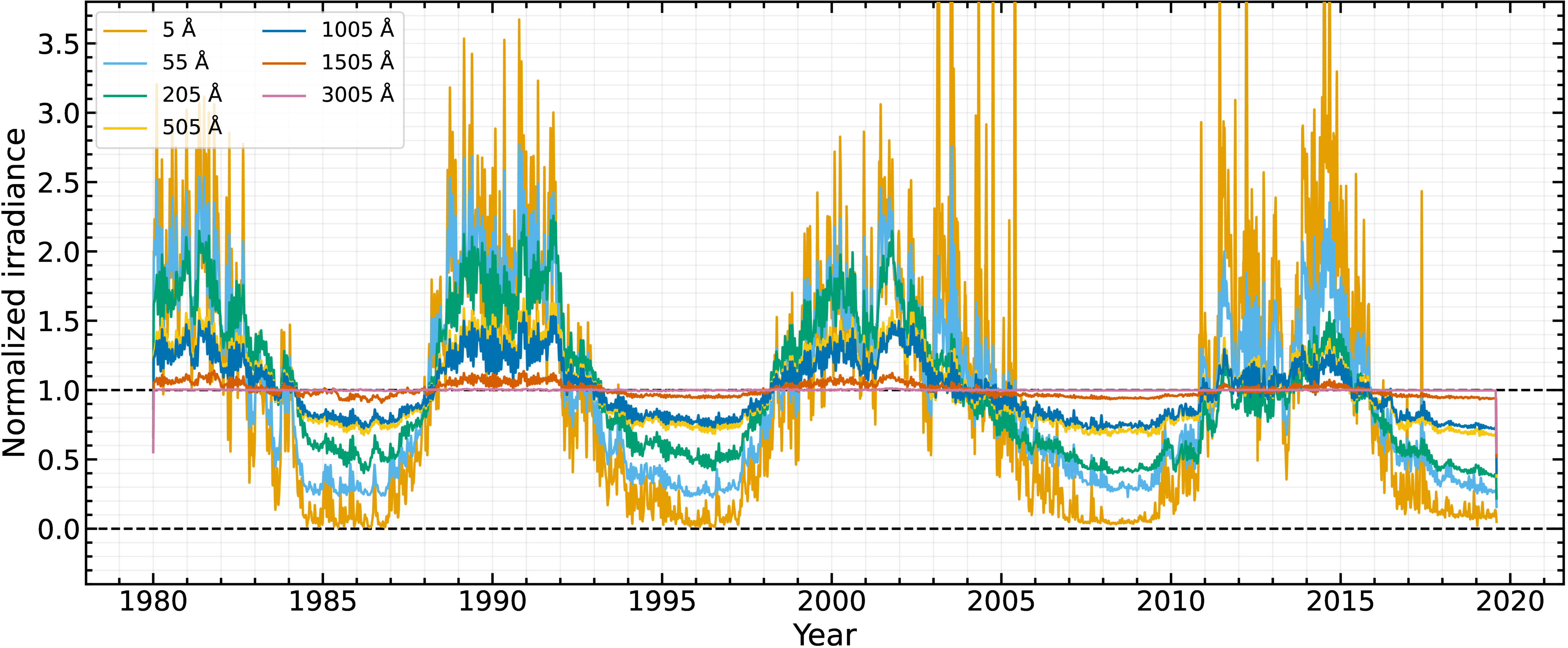 Solar irradiance normalized to the average value. Data are shown as a 10 day rolling average normalized to the average of the entire time series. Data were retrieved from the LISIRD database.
