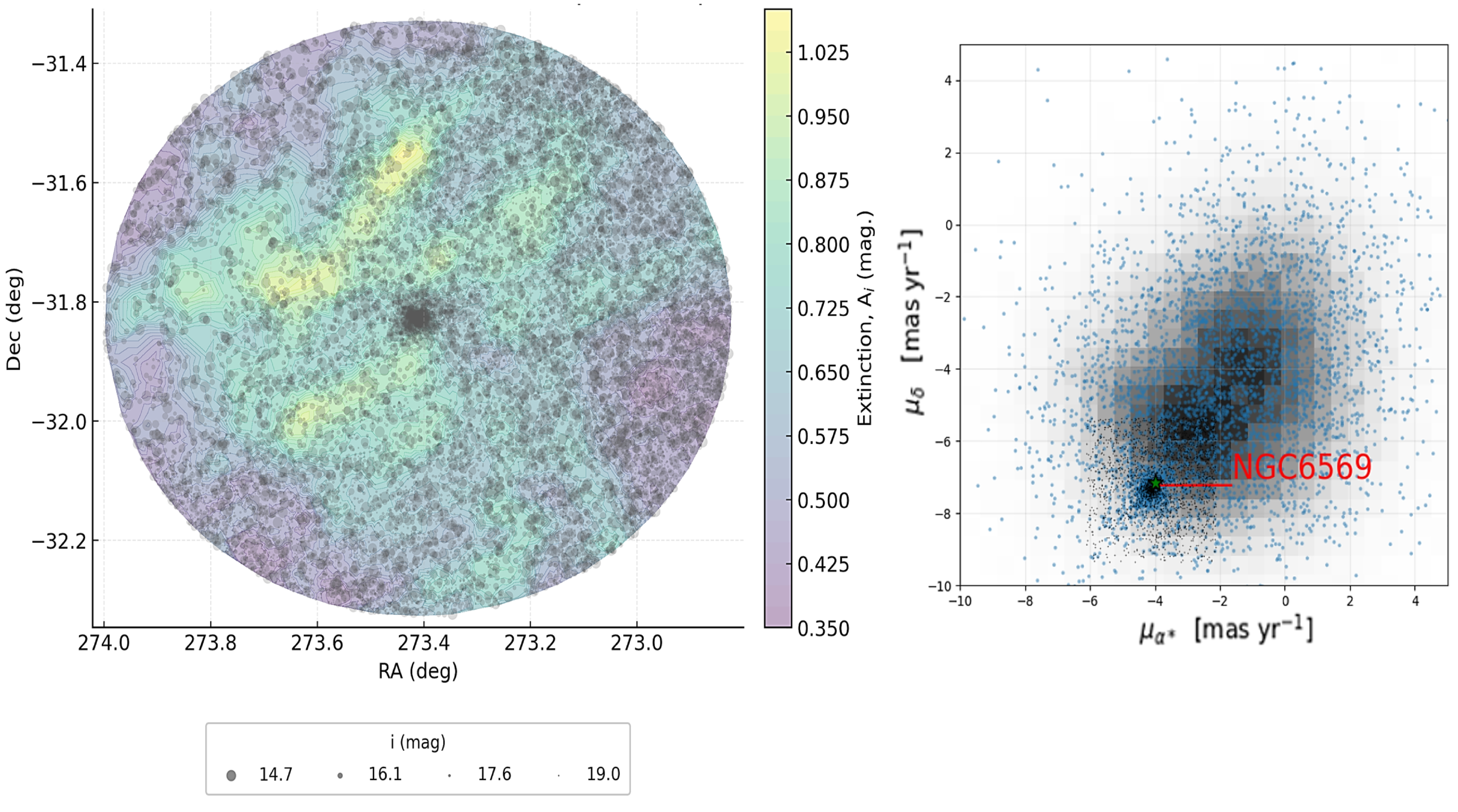 (a) The 18,180 objects within a radius of 30﹩^{\prime} ﹩ of the cluster center, at R.A. = 273﹩\mathop{.}\limits^{\unicode{x000b0}}﹩412000, decl. = –31﹩\mathop{.}\limits^{\unicode{x000b0}}﹩826444 with BDBS i-band measurements between 10.4 and 19.8 mag., overlaid on a variable extinction map (I. T. Simion et al. 2017; J. A. Kader et al. 2023) in the BDBS i band. (b) Gaia DR3 sources were queried from gaiadr3.gaia_source around the SIMBAD center of NGC 6569 and filtered to have measured proper motions, G < 19, and RUWE < 1.4. Three subsets are shown: (i) an inner ﹩{5}^{{\prime} \rm{}\,\rm{}\,}﹩ circle around the cluster center (“cluster”; blue points), (ii) a ﹩1{5}^{{\prime} \rm{}\,\rm{}\,}﹩–﹩6{0}^{{\prime} \rm{}\,\rm{}\,}﹩ annulus (“bulge/field”; gray density histogram, randomly subsampled to 1.2 × 105 rows via random_index for speed), and (iii) a ﹩{2}^{{\prime} \rm{}\,\rm{}\,}﹩ core used only to estimate the cluster’s mean motion. The green star marks the median cluster proper motion from the ﹩{2}^{{\prime} \rm{}\,\rm{}\,}﹩ core. Tiny black dots show proper motions from our BDBS catalog overplotted on the same axes. Axes are ﹩{\mu }_{\alpha * }\equiv d\alpha /dt\cos \delta ﹩ versus μδ, in mas yr−1. No parallax or CMD cleaning is applied here, so the ﹩{5}^{{\prime} \rm{}\,\rm{}\,}﹩ (blue) selection includes some field contaminants.