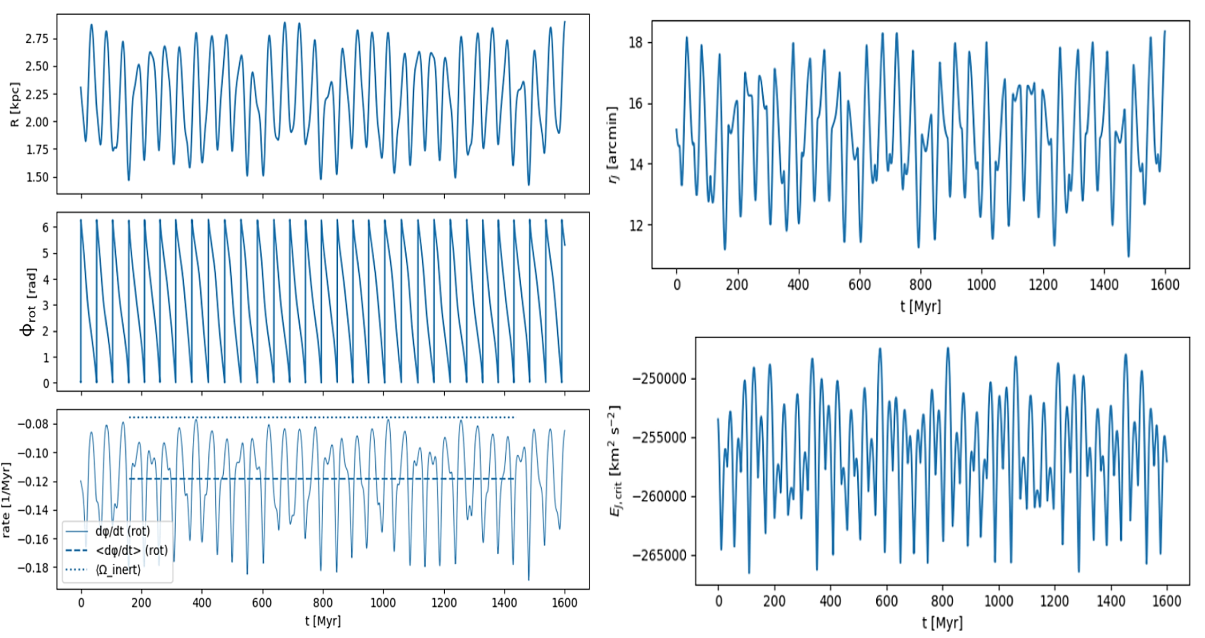 Left Column: Orbital evolution of NGC 6569 in our barred MW model (integrated with GALA). Top: Galactocentric cylindrical radius R(t). Middle: Bar-frame azimuth ϕrot(t). Bottom: Instantaneous bar-frame angular rate dϕ/dt (solid), its time–average (dashed), and the inertial-frame circular frequency Ω (dotted). The listed characteristic periods (Tϕ inertial, Trel bar frame, TR, TZ) are measured from the same integration. Quasiperiodic beating reflects pericenter passages and the coupling with the rotating bar. Right Column: Time variation of the Jacobi (Roche) radius (rJ) and the critical Jacobi (EJ,crit) energy along the same orbit and in the same rotating bar frame. Top: rJ(t) in arcminutes at D = 10.53 kpc. Bottom: EJ,crit(t), computed from the effective potential Φeff evaluated at the L1/L2 saddle points. The “breathing” of rJ (smaller near pericenter, larger near apocenter) is mirrored by the modulation of EJ,crit. These curves are used to assess boundness by comparing stellar EJ to EJ,crit(t).