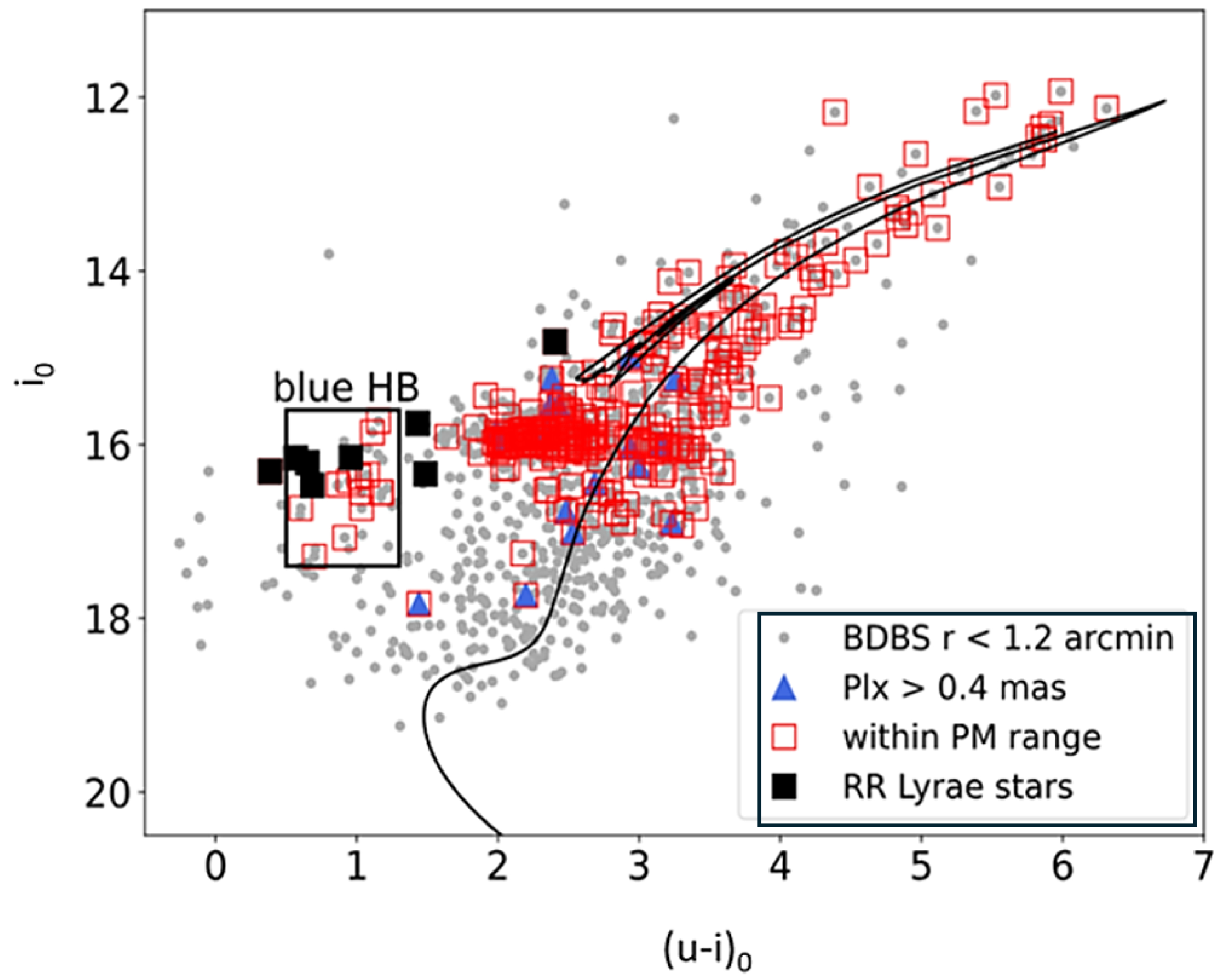 The BDBS differentially dereddened CMD for i0 versus (u − i)0 is shown. The small, gray-filled circles are the stars within 1﹩\mathop{.}\limits^{^{\prime} }﹩2 of the center of NGC 6569. The following objects are identified within 5 tidal radii of the center of the cluster: stars within 0﹩\mathop{.}\limits^{\unicode{x000b0}}﹩95 of the cluster center; stars must have a PM within 1 mas yr−1 in R.A. and within 1.5 mas yr−1 in decl. of the main cluster PM: a box drawn between (∼–4.125 ± 1.0 mas yr−1, ∼–7.354 ± 1.5 mas yr−1). Additional constraints were applied: objects with BDBS u magnitudes with uncertainties <0.04 mag. were selected if they had detections in the BDBS g and i bands also. The red open squares were identified as targets for AAT/AAOmega spectroscopy. Blue triangles are flagged as likely foreground objects, and black-filled squares are identified as RRLs. The isochrone shown is from the MIST models (J. Choi et al. 2016), [Fe/H] = –0.75 dex, scaled for [α/Fe] = +0.3 dex external to MIST, with an age of 13 Gyr.