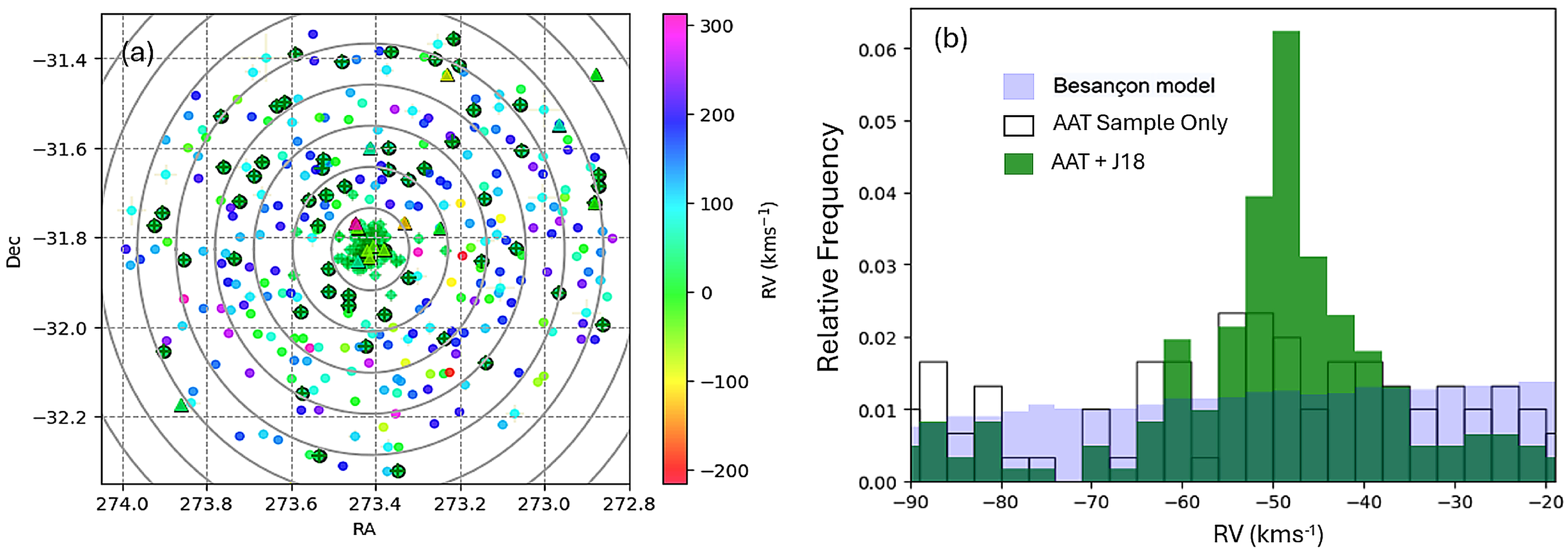 (a) A map of the R.A. versus decl. positions of the 303 spectroscopic targets (two fibers did not yield measurable spectra) in and around NGC 6569 (shaded circles), along with some known RRL stars (OGLE) with cataloged RVs (filled triangles). The circles are color-coded by RV (see color bar on the right). The 100 objects from J18 are shown as green crosses in the cluster center. The gray circles are successive tidal radii (S. Ortolani et al. 2001; E. Valenti et al. 2011, 6﹩\mathop{.}\limits^{^{\prime} }﹩9 ) from the center of NGC 6569. We choose our search limit as −25 > RV > −65 km s−1, yielding 58 objects (black-edged green circles with black pluses). (b) The relative number of stars per bin is shown in this histogram of the cluster’s RV range yielded by J18, from −30 > RV > −63 km s−1. The 100 stars from J18 were added to our 303 targets to find the cluster (green bars). The AAT sample only is shown as the black line (no shading). The Besançon Galactic population models for our FOV and PM limits are seen in mauve.