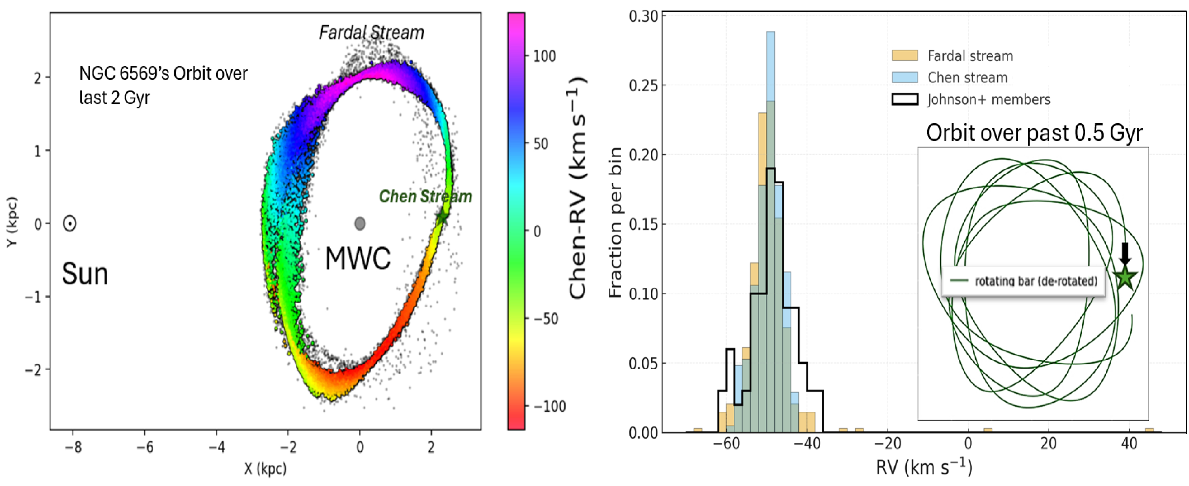 Left Panel: The GALA-generated mock-tidal streams are shown in the Galactocentric frame (MW center is shown as the gray filled circle), where the black-bordered green-filled star is the position of NGC 6569 at the present epoch coordinates X, Y, and Z, are (2.303, 0.087, −1.229) kpc. Our position is shown as the Sun symbol. GALA was set to have star particles ejected every 0.5 Myr for 2.0 Gyr. Y. Chen et al.’s (2025) mock-stream star particles are color-coded by the HRV (right color bars), and M. A. Fardal et al.’s (2015) star particles are shown as the gray dots. Right Panel: The relative number histograms are shown for the J18-observed CaT-sample stars (heavy black outline), the Chen mock-stream star particles (aqua shading), and the Fardal mock stream (sand-colored shading), released in the last 0.5 Gyr, having our AAT-selection of PM, and found in our FOV. The inset shows the orbit for the last 0.5 Gyr, with the motion shown by the black arrow above the star cluster (black-bordered green star). The cluster was last at pericenter ∼48.5 Myr ago.