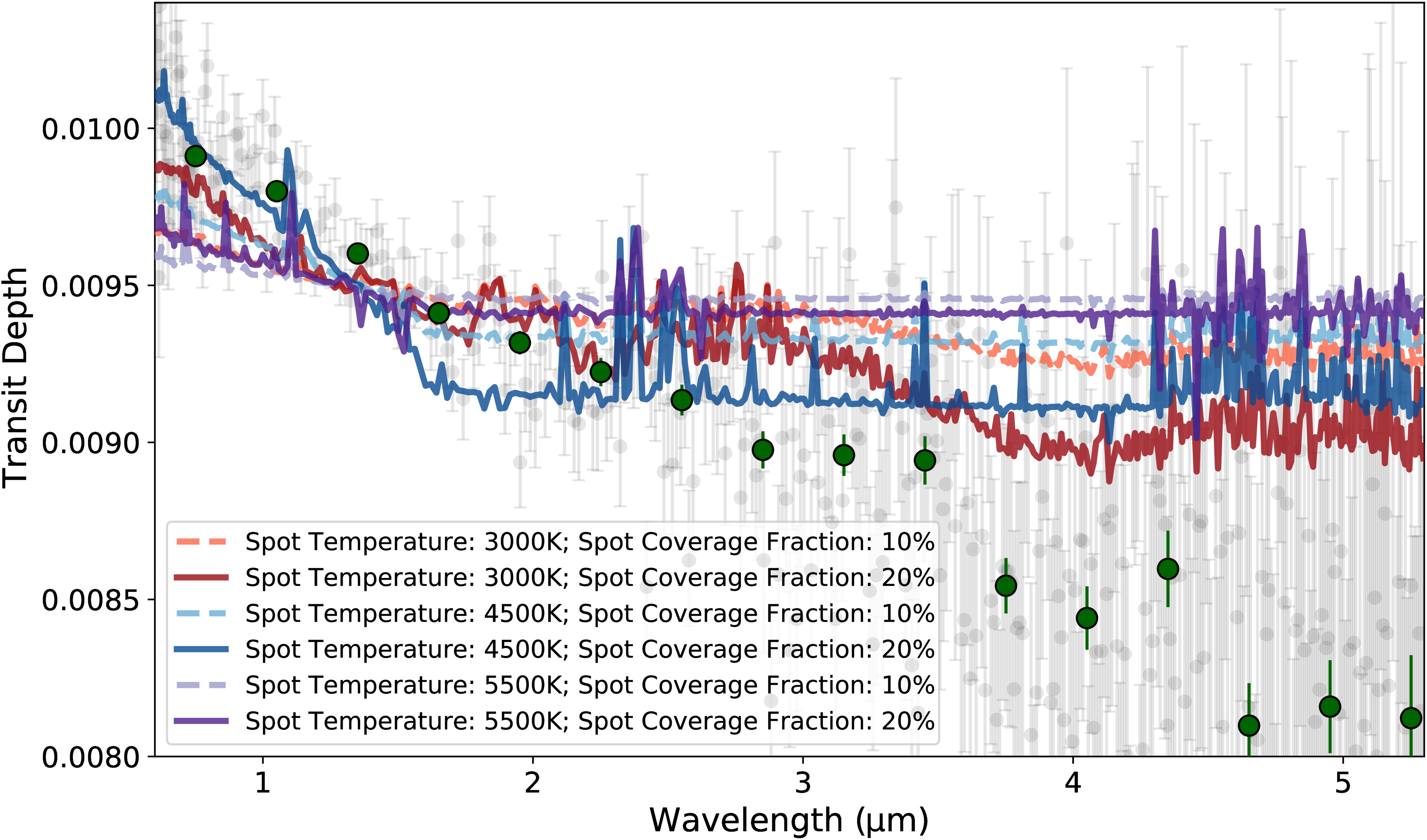 Kepler-51d’s transmission spectrum (gray) and binned spectrum (green) plotted against different simulated transmission spectra assuming only stellar contamination. Each model assumes a photospheric temperature of 5800 K with a varying spot temperature and spot coverage fractions. Spot coverage fractions <5% yielded a nearly flat line or no stellar contamination impact. While cold spots at large coverage fractions could reproduce the bluer <2 μm wavelength slope, no spot temperature and coverage fraction can explain the observed >2 μm slope. Therefore, the transmission spectrum must be due to planetary atmospheric absorption.