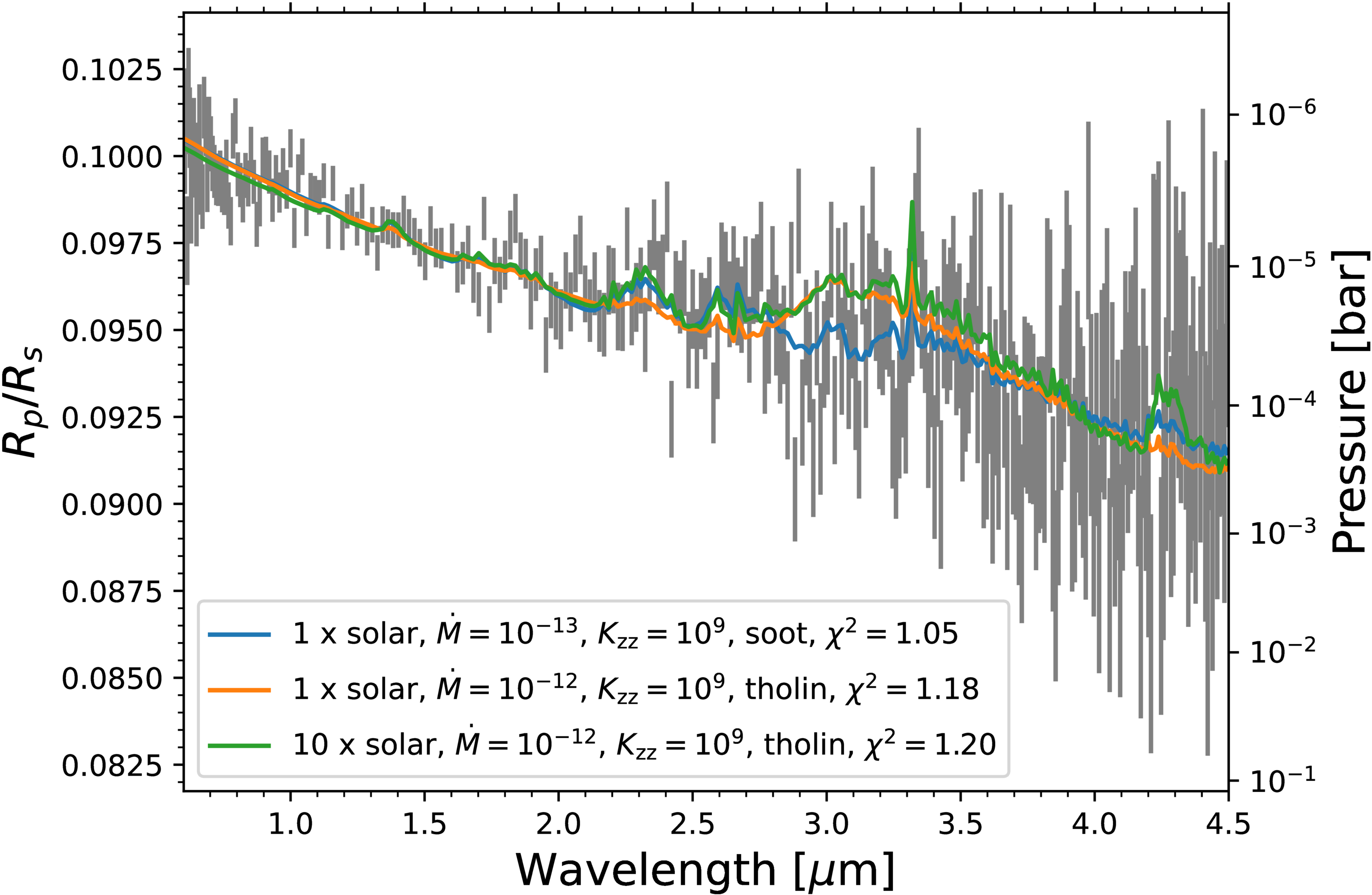 Spectrum models for the three best-fit cases. The right vertical axis indicates the corresponding pressure levels for the best-fit model (blue line), which assumes a metallicity of 1× solar, a monomer production rate of ﹩\dot{M}=1{0}^{-13}﹩ g cm−2 s−1, an eddy diffusion coefficient of Kzz = 109 cm2 s−1, and soot optical properties.
