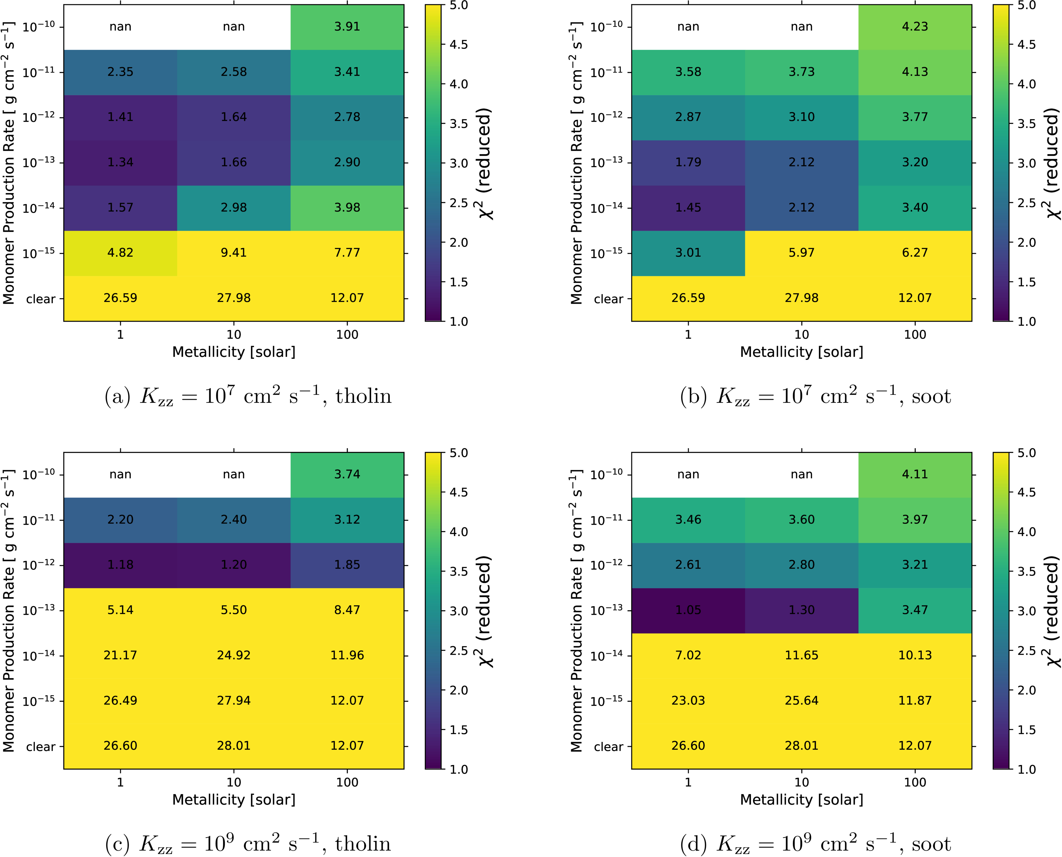 Goodness of fit for the parameter space (atmospheric metallicity, haze monomer production rate, eddy diffusion coefficient, and haze optical properties) explored using the haze models. Note that the haze microphysical simulation failed to converge for cases with a haze monomer production rate of 10−10 g cm−2 s−1 in the 1× and 10× solar-metallicity cases due to the extremely high monomer production rate.
