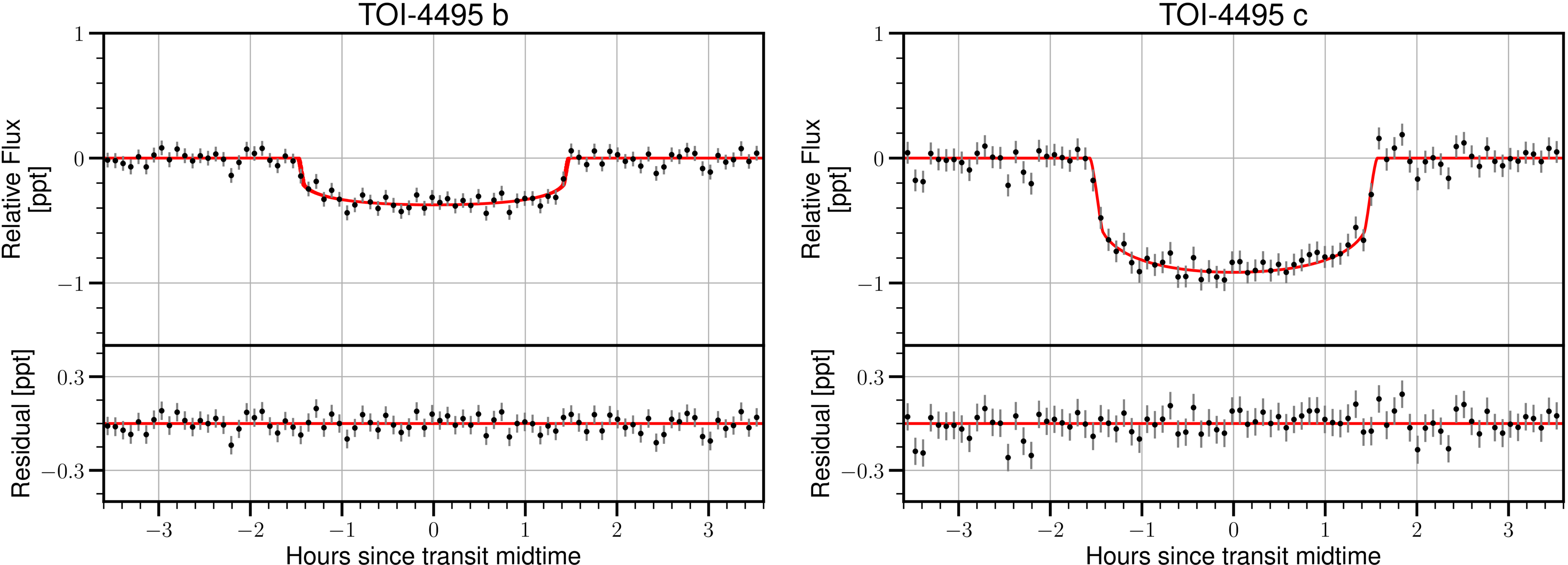 Phase-folded TESS transit light curves of TOI-4495 b and c after accounting for TTVs, binned to 5 min. Red line is the best-fit photodynamics model (Section 5.3)
