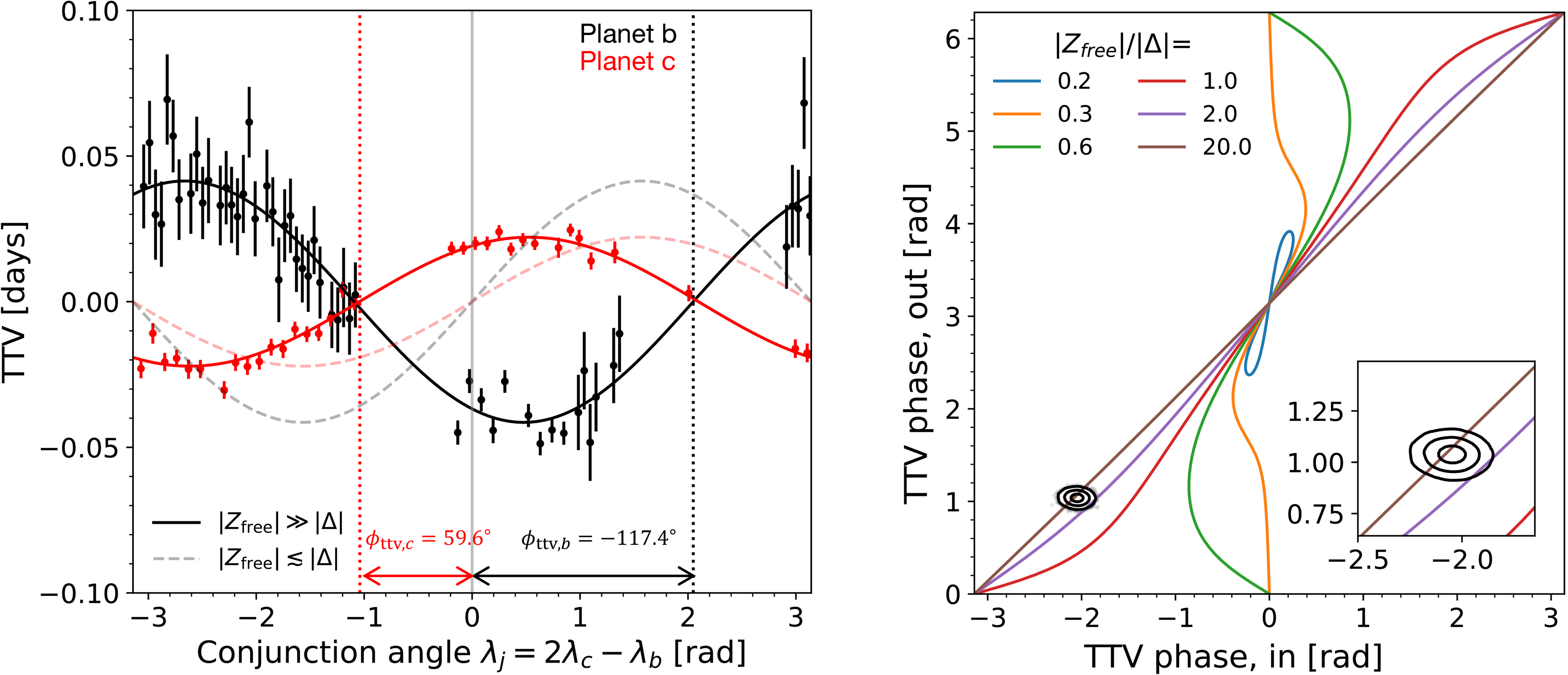 Left: TTVs of planet b (black) and planet c (red) phased to the conjunction angle λj = 2λc–λb. If the free eccentricity Zfree is small compared to Δ, no TTV phase shift is expected (dashed lines; TTV = 0 when λj = 0), which is inconsistent with the observations (solid lines). We measure TTV phases (vertical dotted lines) of ﹩{\phi }_{b}=-117.4\pm 3\mathop{.}\limits^{^\circ }5﹩ and ﹩{\phi }_{c}=59.5\pm 2\mathop{.}\limits^{^\circ }2﹩ for planets b and c, respectively. Right: TTV phases of two planets near the 2:1 MMR. Colored curves show theoretical TTV phases for different values of Zfree. When Zfree is comparable to or larger than Δ, nonzero TTV phases arise. The TTV phase posteriors are shown as contours corresponding to the 1σ, 2σ, and 3σ credible levels. For TOI-4495, the TTV data favor ∣Zfree∣ values larger than Δ by a factor of a few. See Section 5.2 for further discussion.
