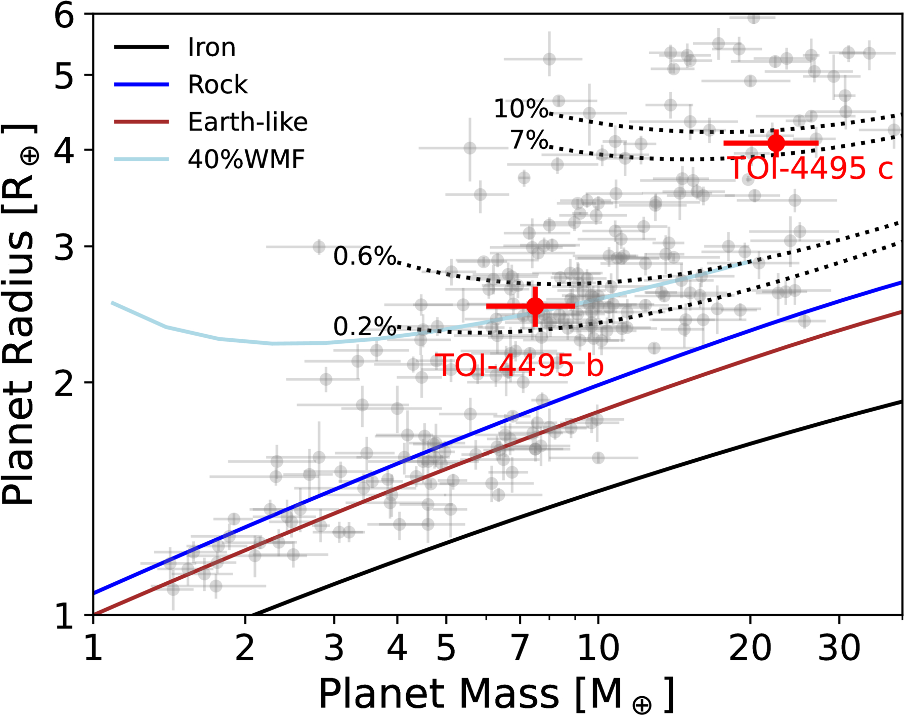 Masses and radii of the TOI-4495 planets and other planets with measured precision > 3σ from the NASA Exoplanet Archive (J. L. Christiansen et al. 2025). Both axes are shown in log scale. Theoretical mass–radius relationships for pure-iron, pure-rock, and Earth-like compositions are shown in black, blue, and brown, respectively (L. Zeng et al. 2016). TOI-4495 b is consistent with either possessing a thin H/He envelope comprising 0.2%–0.6% of its total mass (black dotted lines) or being an ocean world with a water mass fraction of approximately 40% (light blue; A. Aguichine et al. 2021). TOI-4495 c is consistent with hosting a more substantial H/He envelope, accounting for 7%–10% of its total mass.