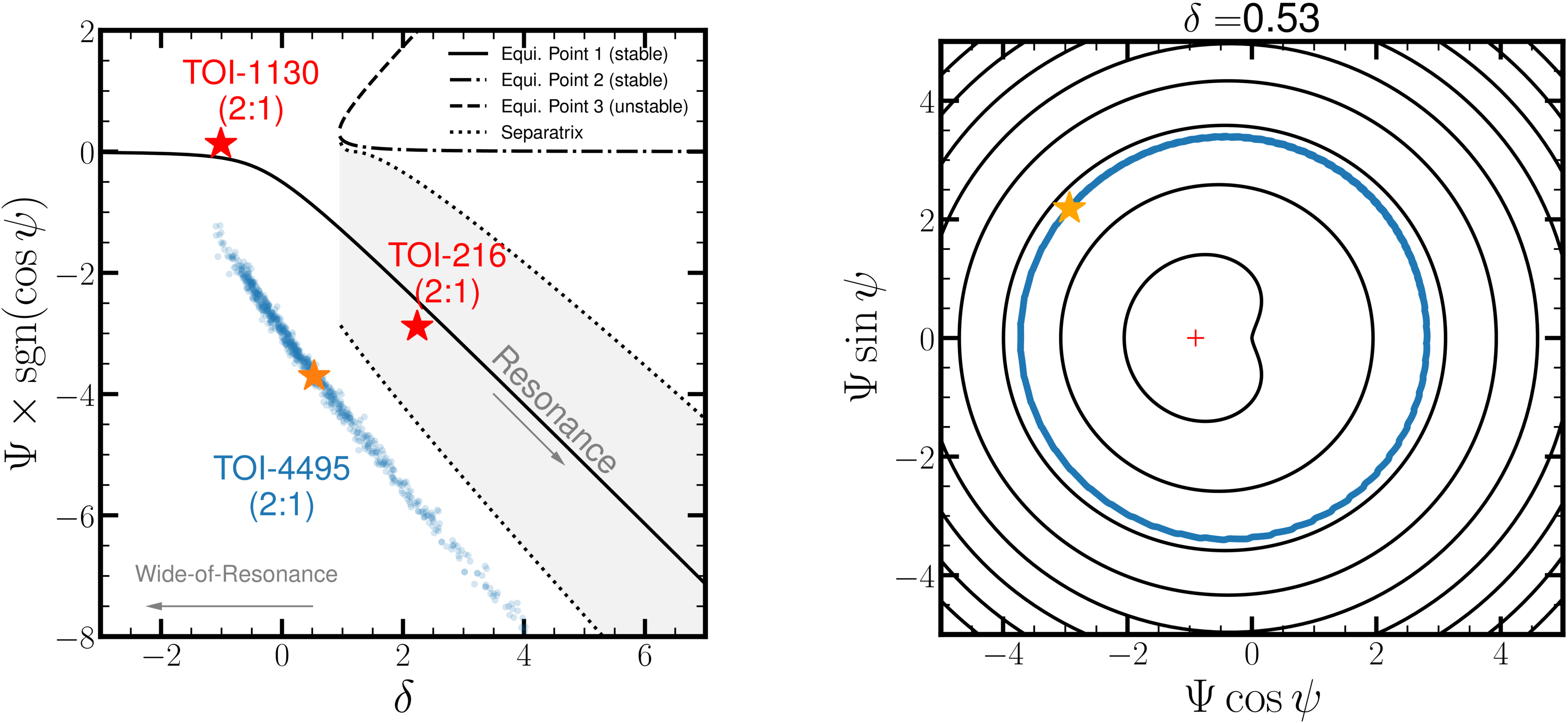 Hamiltonian of first-order MMR, adapted from D. Nesvorný & D. Vokrouhlický (2016). Left: location of fixed points (solid, dashed, and dotted–dashed lines) and separatrix (dotted lines) as a function of δ, a parameter that measures the proximity to resonance. ψ is the resonant angle, and its conjugate momentum, Ψ, scales with the combined eccentricity of planets. Resonant orbits, shown as a shaded area and enclosed by the separatrix, exist in δ > 0.95. Blue points are the posterior of TOI-4495 from the photodynamics analysis, which has ﹩\delta =0.{4}_{-0.7}^{+1.9}﹩. Orange star is the best-fit solution. We also show the resonant TOI-216 and near-resonant TOI-1130 for comparison. Right: phase space at δ = 0.53. The blue trajectory is the integrated orbit of the best-fit solution (orange star in the left figure), which suggests a circulating solution. The red cross is the stable equilibrium point (solid line on the left).