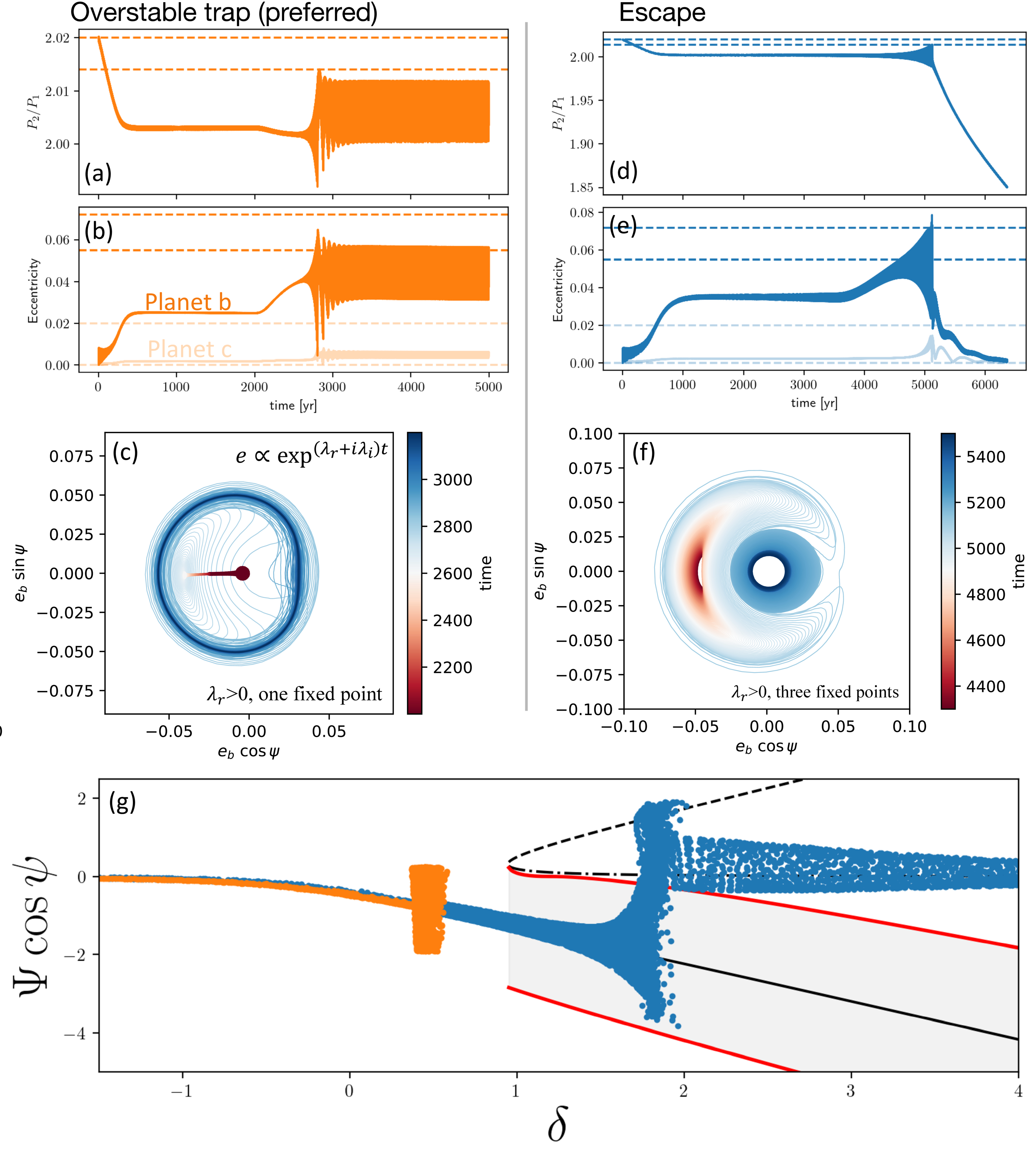 Outcomes of the dissipative resonant evolution of TOI-4495 analogs, categorized by the stability of equilibrium points and the number of fixed points at capture. Panels (a)–(c): period ratio, eccentricity, and resonant angle ψ during an overstable trap. In this regime, the real part of the eigenvalue is positive (λr > 0), but the resonant fixed point has not bifurcated. Eccentricities are excited and saturate at finite values, leading to wide oscillations around the equilibrium. Panels (d)–(f): the same quantities for resonant escape. Here, the real part of the eigenvalue is positive, and the conservative fixed point has bifurcated. Eccentricities continue to grow until the system crosses into the inner circulation region, moving narrowly away from the 2:1 MMR. The planets then escape resonance and migrate toward more compact commensurabilities. The dashed lines in the first two columns mark the observed period ratios and eccentricities of TOI-4495. Panel (g): phase-space evolution of the two cases. Both satisfy the analytic overstable condition (λr > 0). In the trap case, the system reaches equilibrium before bifurcation (δ < 0.95), while in the escape case, the trajectory evolves beyond bifurcation (δ > 0.95), resulting in resonant departure.