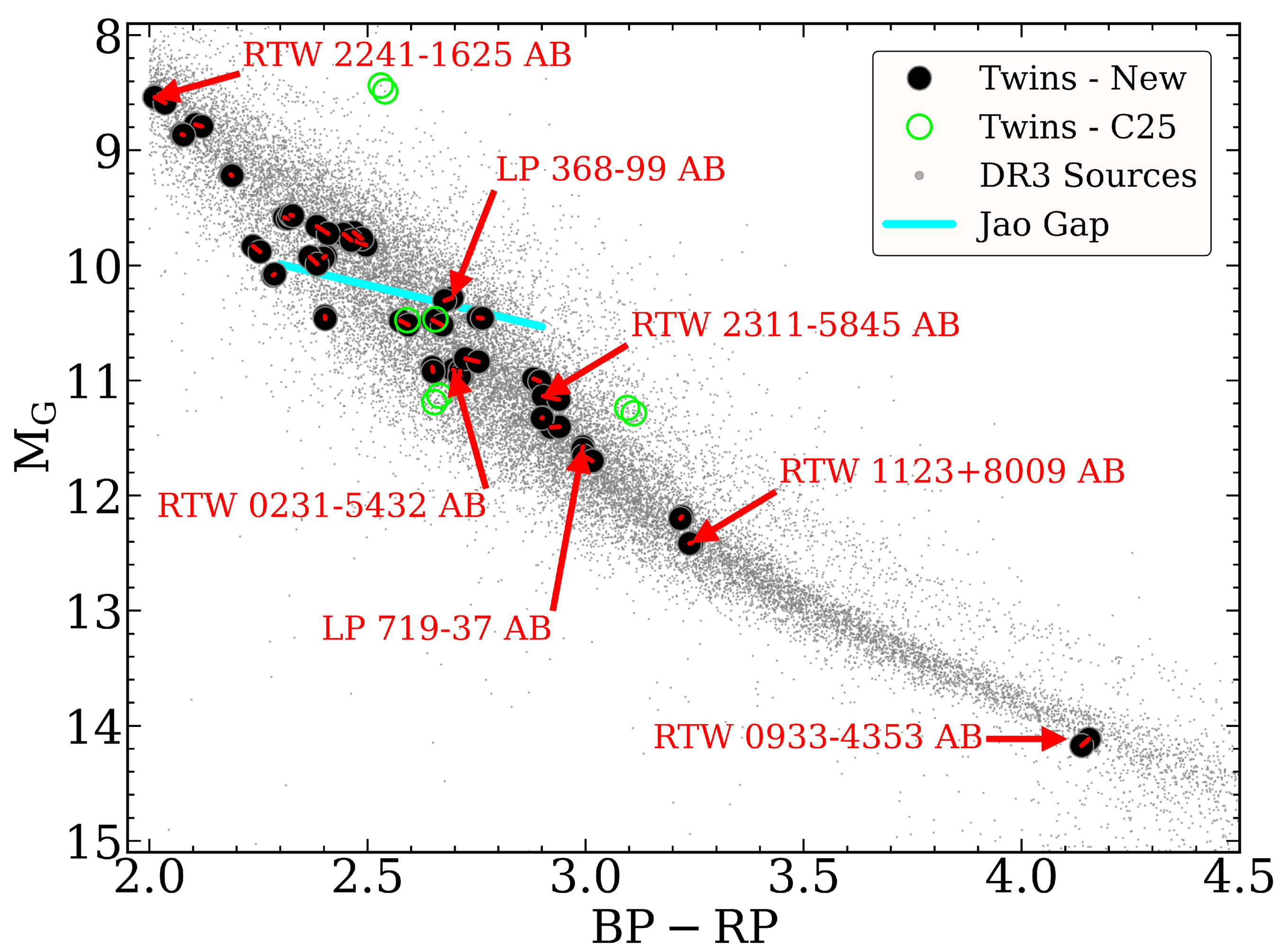 An observational Hertzsprung–Russell diagram (HRD) of our Full Sample using Gaia DR3 values. The 64 components comprising 32 pairs in this paper’s New Systems are shown as black circles, with red lines connecting the components in each pair. Open green circles indicate the remaining four systems (eight components) previously discussed in our first paper in this series (A. A. Couperus et al. 2025, C25). The main sequence is illustrated with gray points using a sample of Gaia DR3 sources within 50 pc. A diagonal cyan line shows the Jao Gap near 0.35 M⊙ (W.-C. Jao et al. 2018, 2023), indicating the transition region for partially convective stars above it and fully convective stars below it. We visually offset the gap upper edge definition from W.-C. Jao et al. (2023) downward by 0.05 mag to better align with the center of the gap region. Various systems discussed throughout this paper are individually identified with red arrows and labels.