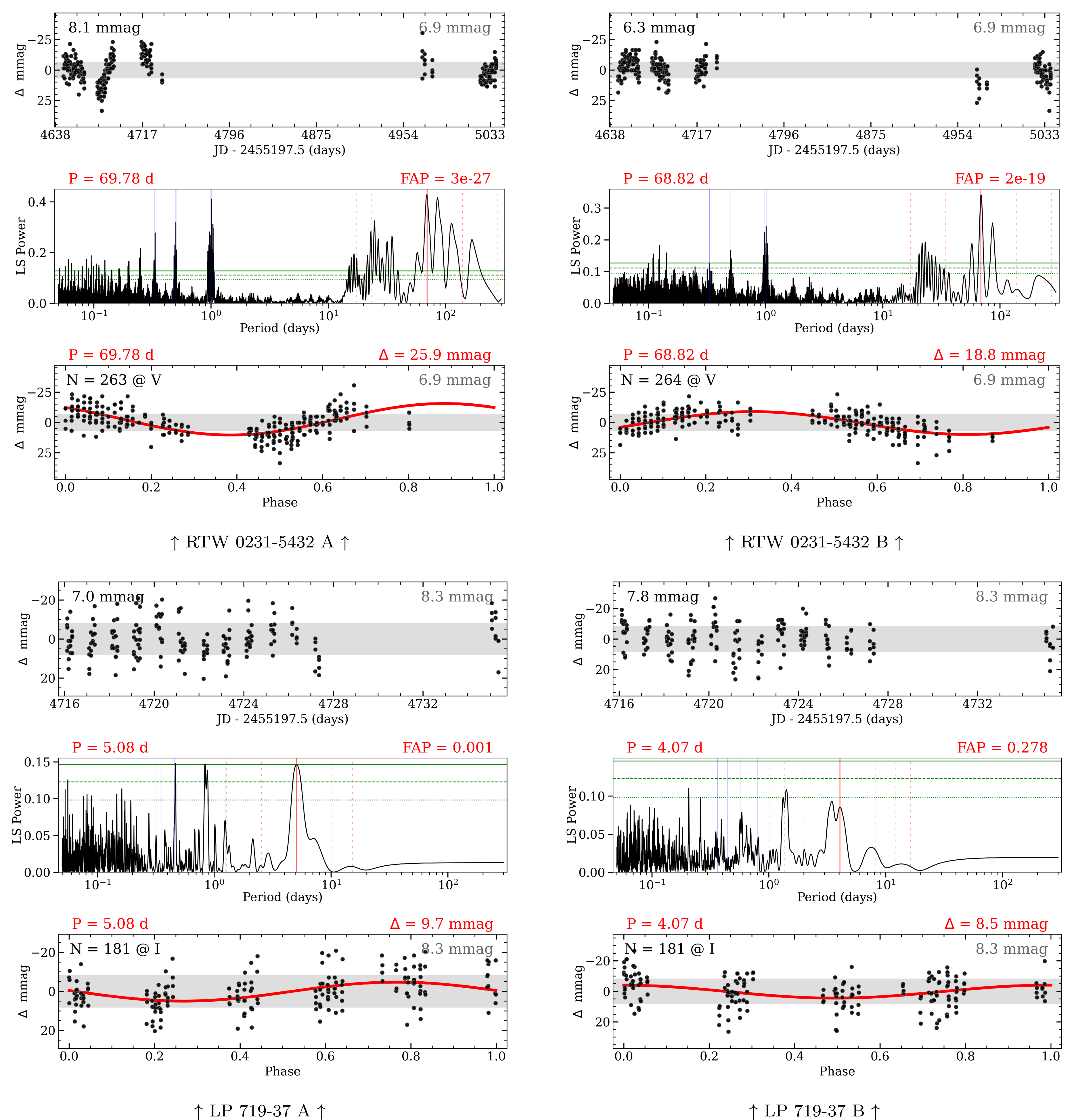 Rotation period results for the six New Systems with values in Table 6 using data from the CTIO/SMARTS 0.9 m. Each vertical trio of panels assesses the data for a single star in a twin pair. The top panel is a differential light curve in a format similar to Figure 8, with times relative to 2010.0 (JD 2455197.5). Black numbers in the top left of this panel indicate the MAD from the mean for the filled points, while gray numbers in the top right are the average MAD of the nonvarying reference stars. These light-curve data are available as Data behind the Figure (DbF) products. The middle panel shows a Lomb–Scargle periodogram of the data above, with horizontal green lines at false-alarm probability (FAP) values of 10% (dotted)/1% (dashed)/0.1% (solid), a vertical red line at the selected periodogram peak, vertical dashed orange lines at the 2/3/4 harmonic multiples, and vertical purple lines at the n = [−3,…, 3] 1 day sampling aliases. The bottom panel shows the corresponding phase-folded light curve based on the rotation period and the epoch of the first point, with the Lomb–Scargle sine wave, rotation period, FAP, and peak-to-peak amplitude (Δ) all shown and given in red. The number of filled points (N) and observing filter are given in the top left of this panel; open points correspond to visits with only one usable frame. Our final adopted rotation periods are often supported by multiple results beyond just these, as discussed in Section 8.
