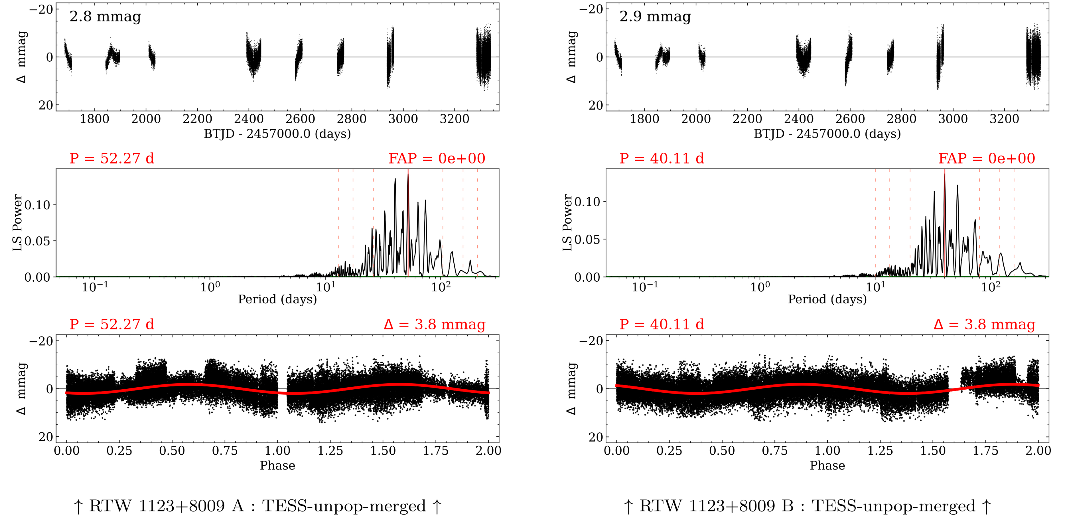 Rotation results from TESS-unpop for RTW 1123+8009 A and B, in the same general format as Figure 11. Data from sectors 14, 20, 21, 26, 40, 41, 47, 53, 60, 73, and 74 are merged in a joint analysis using the basic methods described in Section 8.1. The TESS-unpop data are blended for the two stars given their 9﹩\mathop{.}\limits^{^{\prime\prime} }﹩96 separation, but our apertures were manually chosen to partially minimize the blending, so the results are very similar but slightly different between the two cases. These specific periods are possibly rough half-harmonics of the adopted longer periods from L24, as discussed in Section 8.3.7.