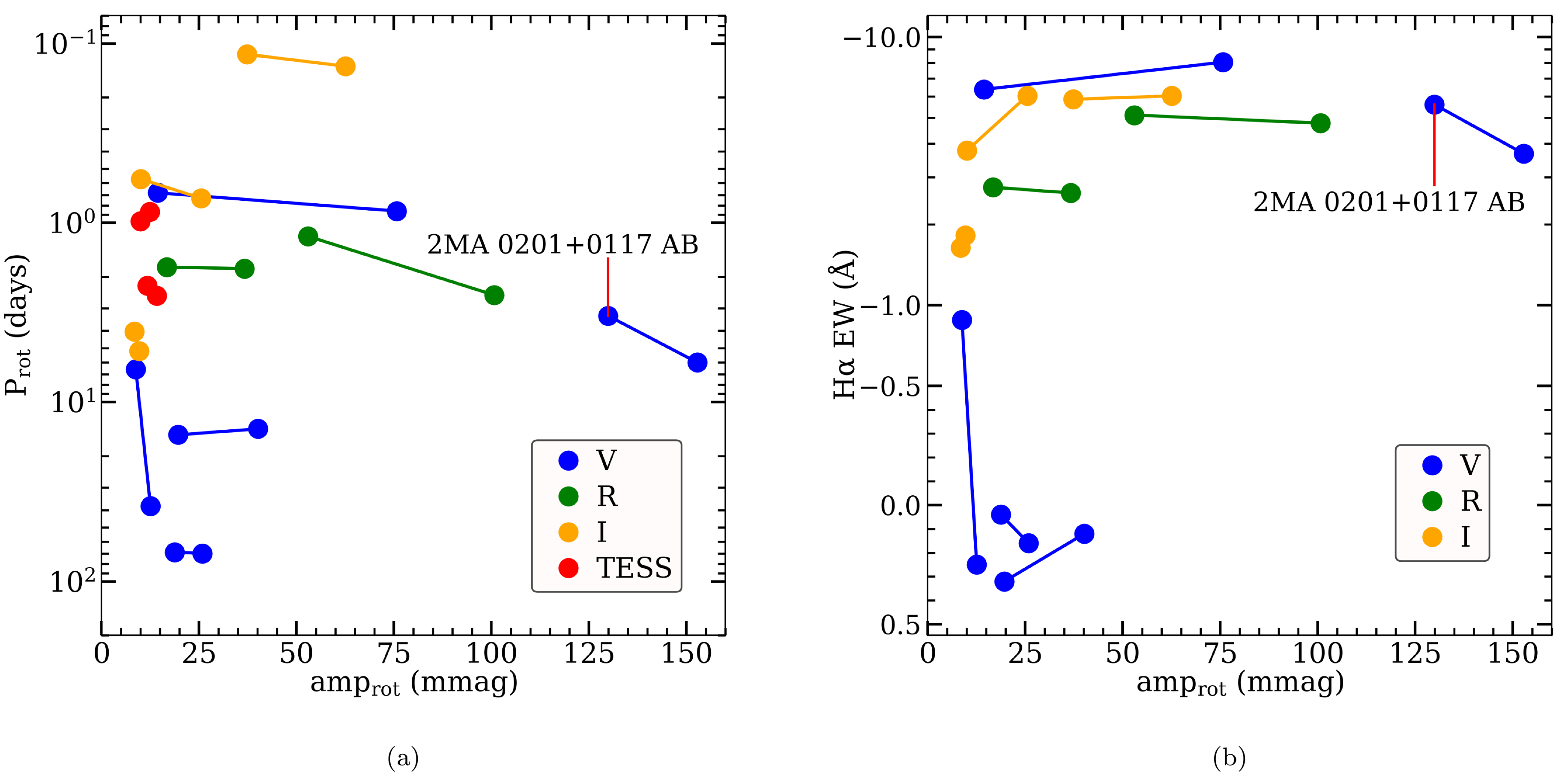 Peak-to-peak rotation photometric amplitudes (amprot) compared with rotation periods in panel (a) and with mean Hα EWs in panel (b) for twin stars from our Results Sample, with lines connecting the components in each binary. Values are from Table 3, Table 6, and C25, with most systems shown here being FC cases. We do not show the range of observed Hα EWs in panel (b) for visual clarity, and only use nonflaring CHIRON epochs with both stars observed back to back. The y-axes are set such that a star with more emission or more rapid rotation moves upward in each plot. Points are color coded by their respective observation filters, which is important considering photometric variability amplitudes will generally appear larger in bluer filters (A. D. Hosey et al. 2015; A. Kar et al. 2024). We include LP 368–99 AB under “R” given the similarity between R and the ZTF zr filter actually used for its amplitude measurements. RTW 0409+4623 AB and RTW 2202+5537 AB are handled as described in Figure 13. The pair with the largest photometric amplitudes is the pre-main-sequence (PMS) system 2MA 0201+0117 AB described in C25. Stars with the largest amplitudes are generally more likely to be active in Hα and relatively rapidly rotating, as expected.