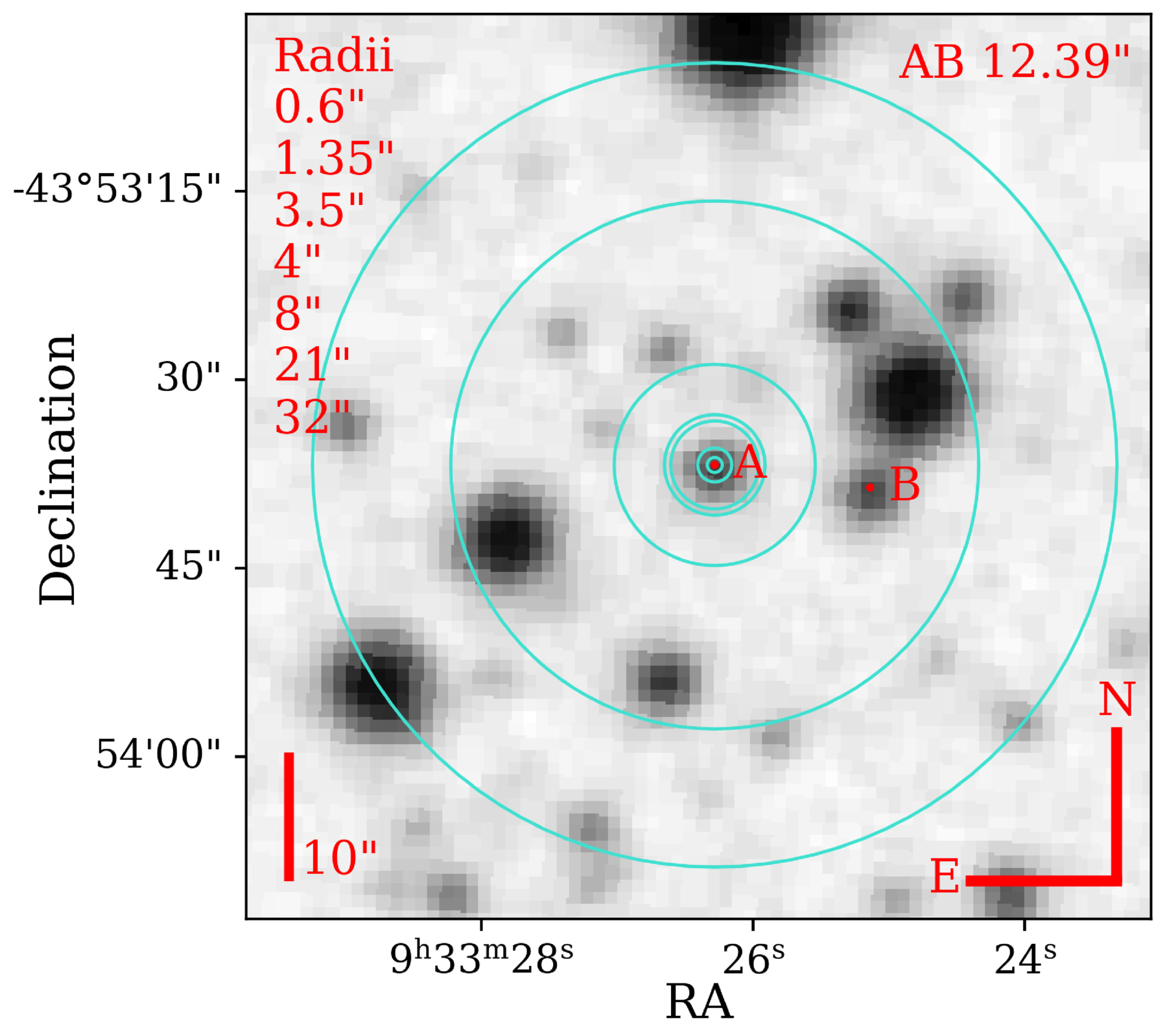 An example archival image from the DSS2-Red survey (B. M. Lasker et al. 1996; R. R. Gal et al. 2004) showing our twin stars RTW 0933–4353 A and B separated by 12″, with A and B shifted by their Gaia DR3 proper motions to 1998.0 for alignment with the image. In order of their listed increasing radii, the blue circles correspond to: (1) the typical 1﹩\mathop{.}\limits^{^{\prime\prime} }﹩2 seeing at CTIO for our SMARTS 0.9 m and 1.5 m observations, (2) the 2﹩\mathop{.}\limits^{^{\prime\prime} }﹩7 diameter CHIRON spectral fiber, (3) the 3﹩\mathop{.}\limits^{^{\prime\prime} }﹩5 Gaia BP and RP measurement region, (4) the 4″ minimum separation of our AB pairs and rough boundary for blending sources in our 0.9 m observations depending on the seeing, (5) the 8″ boundary near which sources begin to blend in ZTF, (6) a single 21″ TESS pixel while keeping in mind that a common TESS aperture is a 3 × 3 pixel grid, and (7) the 32″ boundary at which sources begin to blend in ASAS-SN data. All of our analyses and results here consider the variety of possible AB blending and background contamination impacts, as detailed in Sections 4 and 8.2.