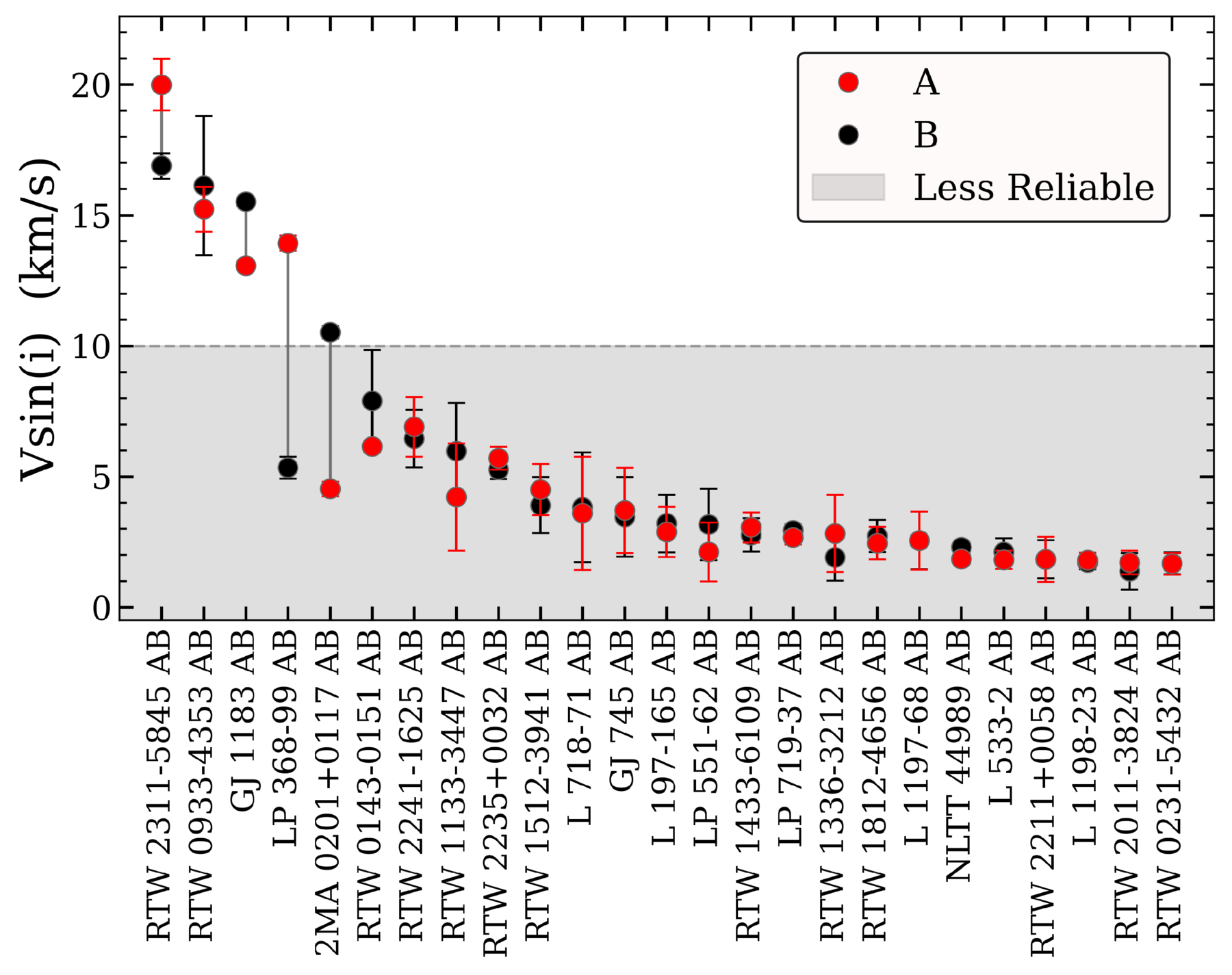 Our CHIRON ﹩v\,\sin (i)﹩ values compared between twin pair components from our Results Sample, using the measurements from Table 3 and C25 and plotting error bars in all cases. Systems are ordered by descending ﹩v\,\sin (i)﹩ value, with vertical gray lines connecting the component stars, and a gray shaded region indicating less-reliable measures at <10 km s−1. The three systems with both stars above 10 km s−1 show broadly similar values between components, while the remaining majority of systems also typically show well-aligned values despite residing in the region of less-reliable measurements. The handful of exceptions are discussed in Section 6.2 and align with their observed component rotation periods.