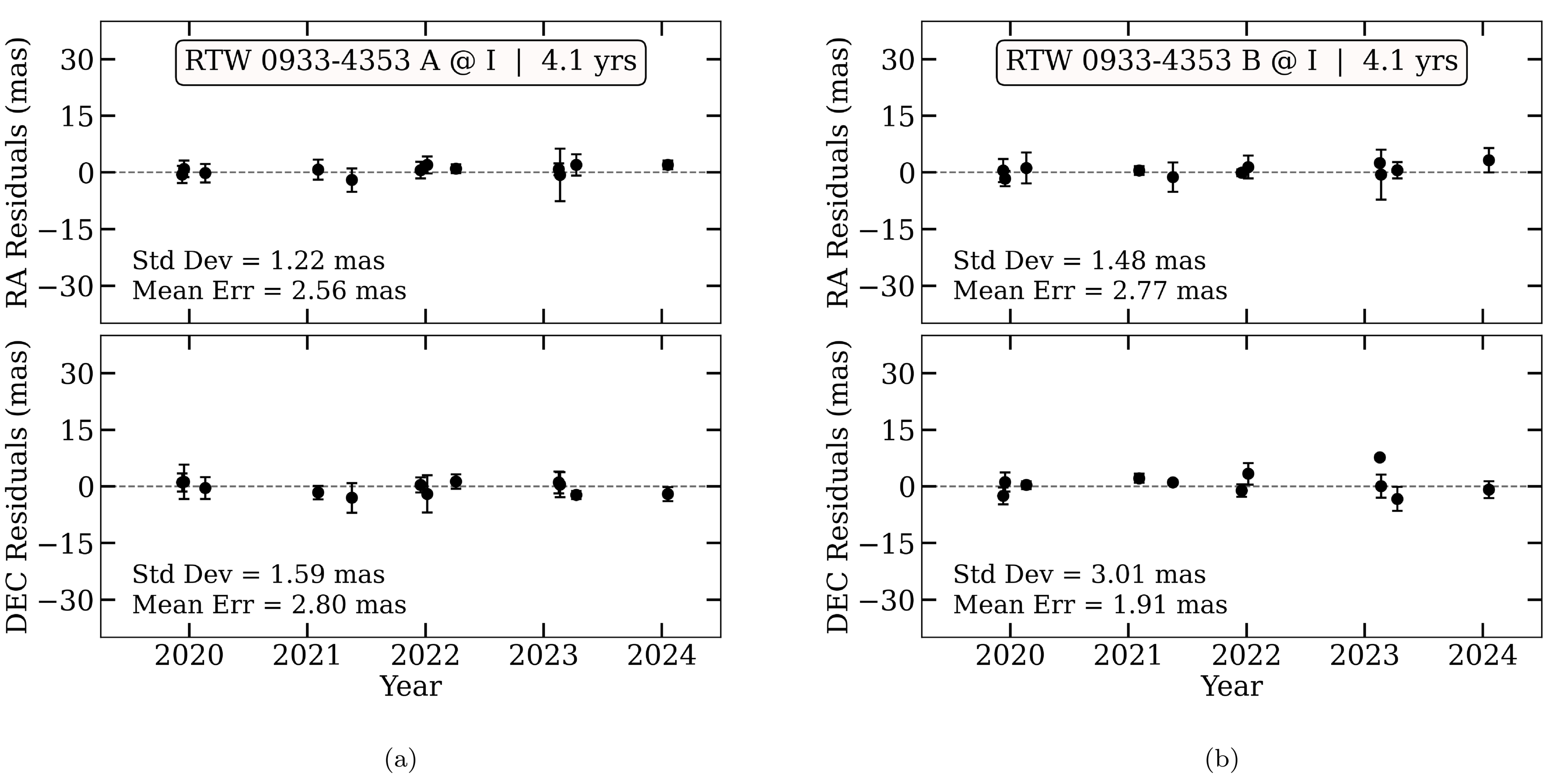 An example set of astrometric results from the 0.9 m long-term program for our twin stars RTW 0933–4353 A and B, using nightly mean points averaged from the multiframe visits. The positional residuals in R.A. (top) and decl. (bottom) after fitting for parallactic motion and proper motion are shown, along with informative statistics and dashed lines at zero. The insets specify the observation filter and data time span. An additional unseen companion could present itself in these photocenter measurements as orbital motion if it existed. The absence of such motions in these data is therefore consistent with neither component hosting an unresolved companion down to the measurement limits, which typically reach to low-mass brown dwarf companions in most orbits out to several times the duration of the time series.