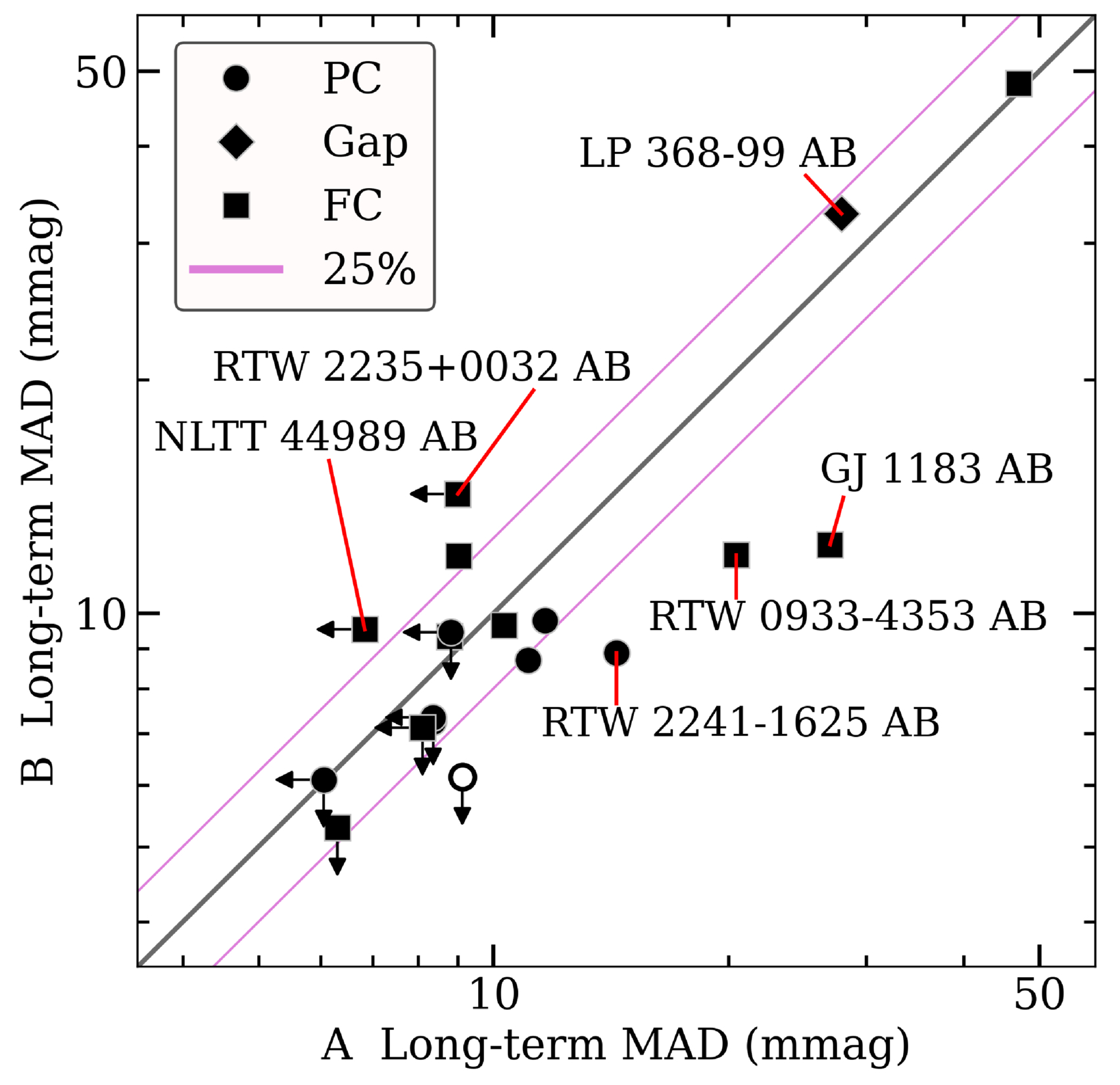 A comparison is given of the 0.9 m long-term photometric variability levels between twin pair components from our Results Sample, using values from Table 5 and C25. A one-to-one line and corresponding 25% (1.25×) bounding lines are shown. Point shapes correspond to the stars’ interior structures as specified in the legend. A star with an MAD variability measure less than or within 10% of its reference field MAD noise level is considered not varying beyond the noise and shows a corresponding upper-limit arrow. The single open circle indicates the system RTW 1133–3447 AB, where the A component’s variability measure is unreliable owing to a contaminating diffraction spike. Several key systems discussed throughout the text are labeled. While sometimes limited in baseline, cadence, and/or precision, these results begin to probe the predictability of long-term multiyear photometric variability in twin M dwarfs.