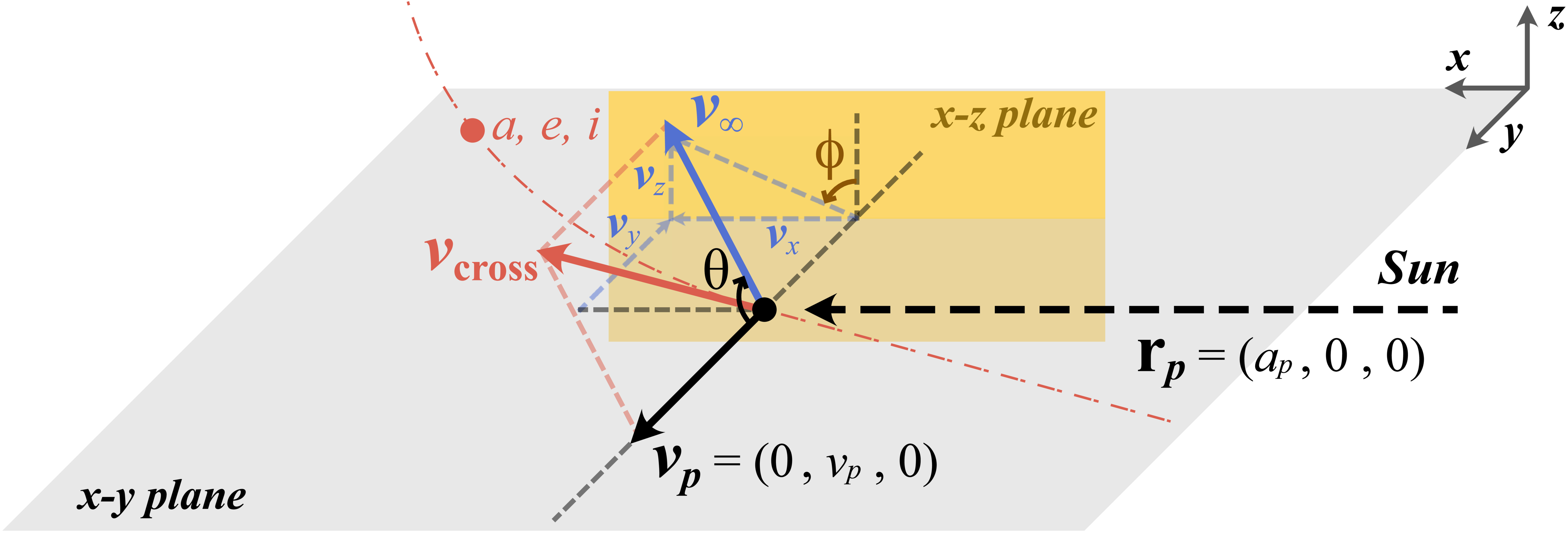 Schematic illustration of the 3D scattering geometry in a planet-centered corotating frame. The z-axis (﹩\hat{{\boldsymbol{k}}}﹩) points out of the orbital plane, while the x-axis (﹩\hat{{\boldsymbol{i}}}﹩) and y-axis (﹩\hat{{\boldsymbol{j}}}﹩) are aligned respectively with the instantaneous radial and transverse directions of the planet at the time of encounter. In this coordinate system, rp lies entirely along the x-axis, and vp (the planet’s velocity, solid black arrow) lies along the y-axis. The small-body’s heliocentric velocity vector at the intersection vcross (solid red arrow) is the vector sum of the relative-velocity vector v∞ (solid blue arrow) and vp. The vector U∞ = v∞/vp is the normalized relative velocity. The two angles θ (the polar angle from vp) and ϕ (the azimuth angle of v∞ in the x–z plane) fully specify the direction of the relative-velocity vector.