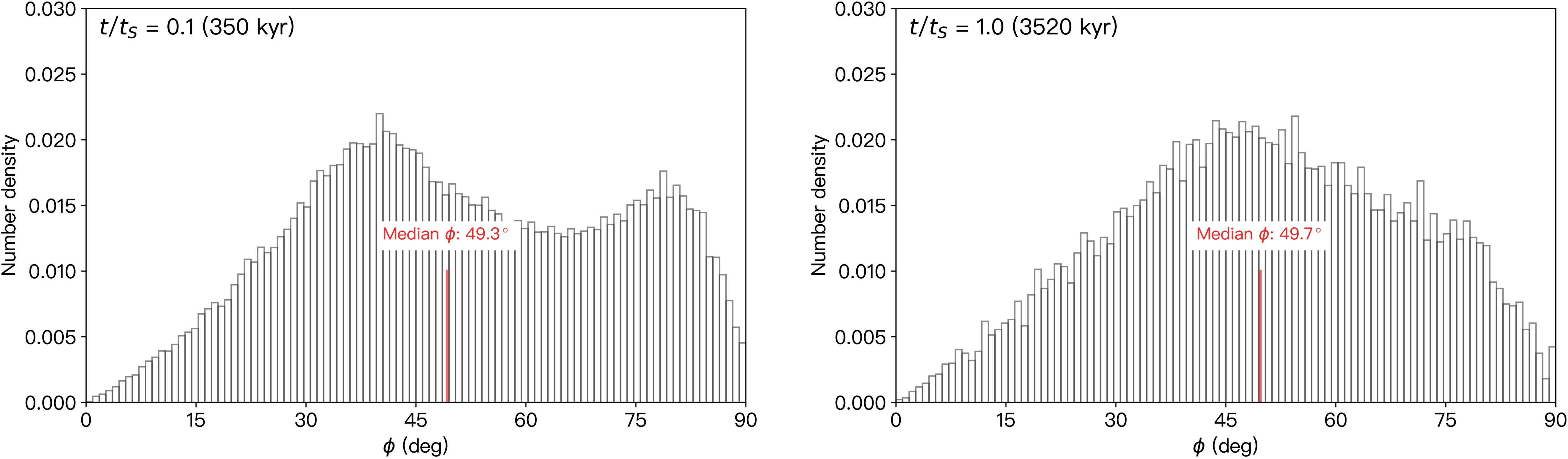 Histograms of ϕ for U∞ = 1 (﹩{ \mathcal T }=2﹩) particles at t = 0.1tS and 1.0tS, respectively. The planet has mass mp = 1 × 10−4M⊙ and ap = 1 au, and the corresponding scattering timescale tS = 3.5 Myr is computed using Equation (58). The initial conditions for the particles are ﹩{{ \mathcal A }}_{0}=1.1﹩, e0 = 0.854, and i0 = 2﹩\mathop{.}\limits^{\unicode{x000b0}}﹩9, corresponding to ϕ0 = 88﹩\mathop{.}\limits^{\unicode{x000b0}}﹩2. The median ϕ during scattering is marked with a red vertical line.