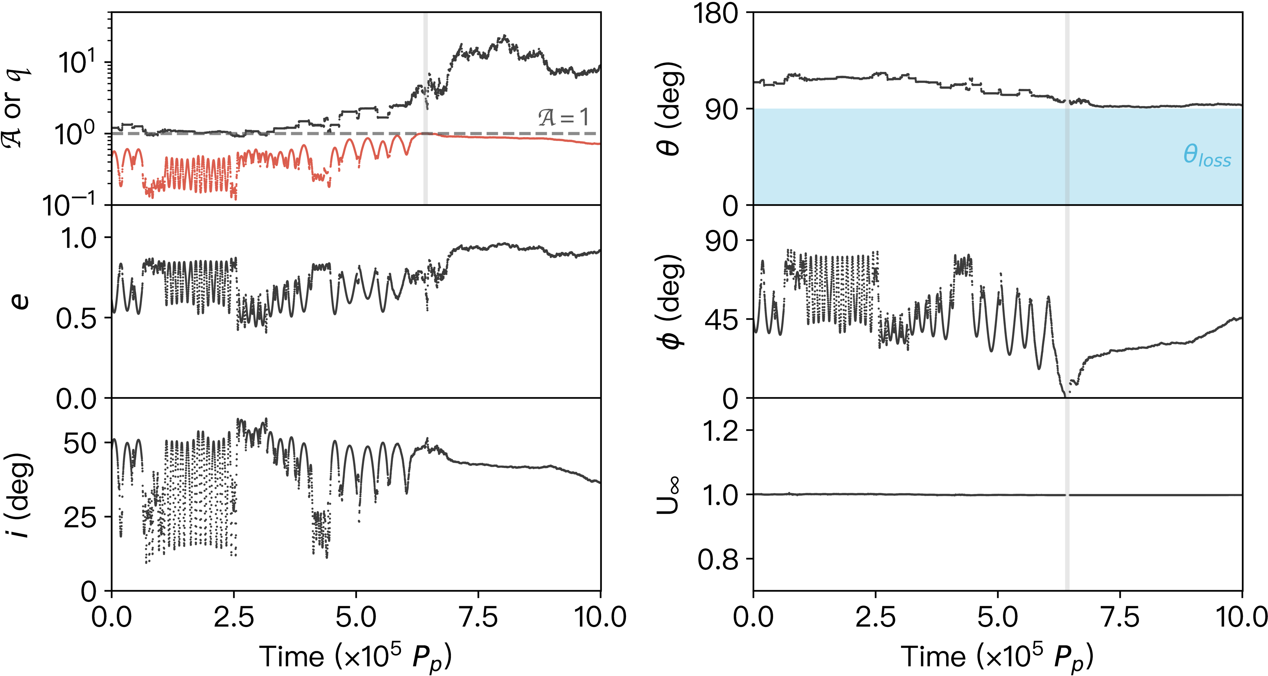 Evolution of a particle with U∞ = 1.0 (﹩{{ \mathcal A }}_{0}﹩=1.2, e0=0.61, i0=47﹩\mathop{.}\limits^{\unicode{x000b0}}﹩8, closely coupled case) in orbital elements (﹩{ \mathcal A }﹩, e, i, left panels) and relative-velocity vectors (θ, ϕ, U∞, right panels) scattered by a mp = 1 × 10−4m⊙ planet on a ap = 1 au circular orbit. The gray regions mark ﹩{\unicode{120006}}﹩ > 1 (red curves), corresponding to where the Öpik framework fails. The blue region in the top-right panel represents the loss cone θloss (Equation (13)).