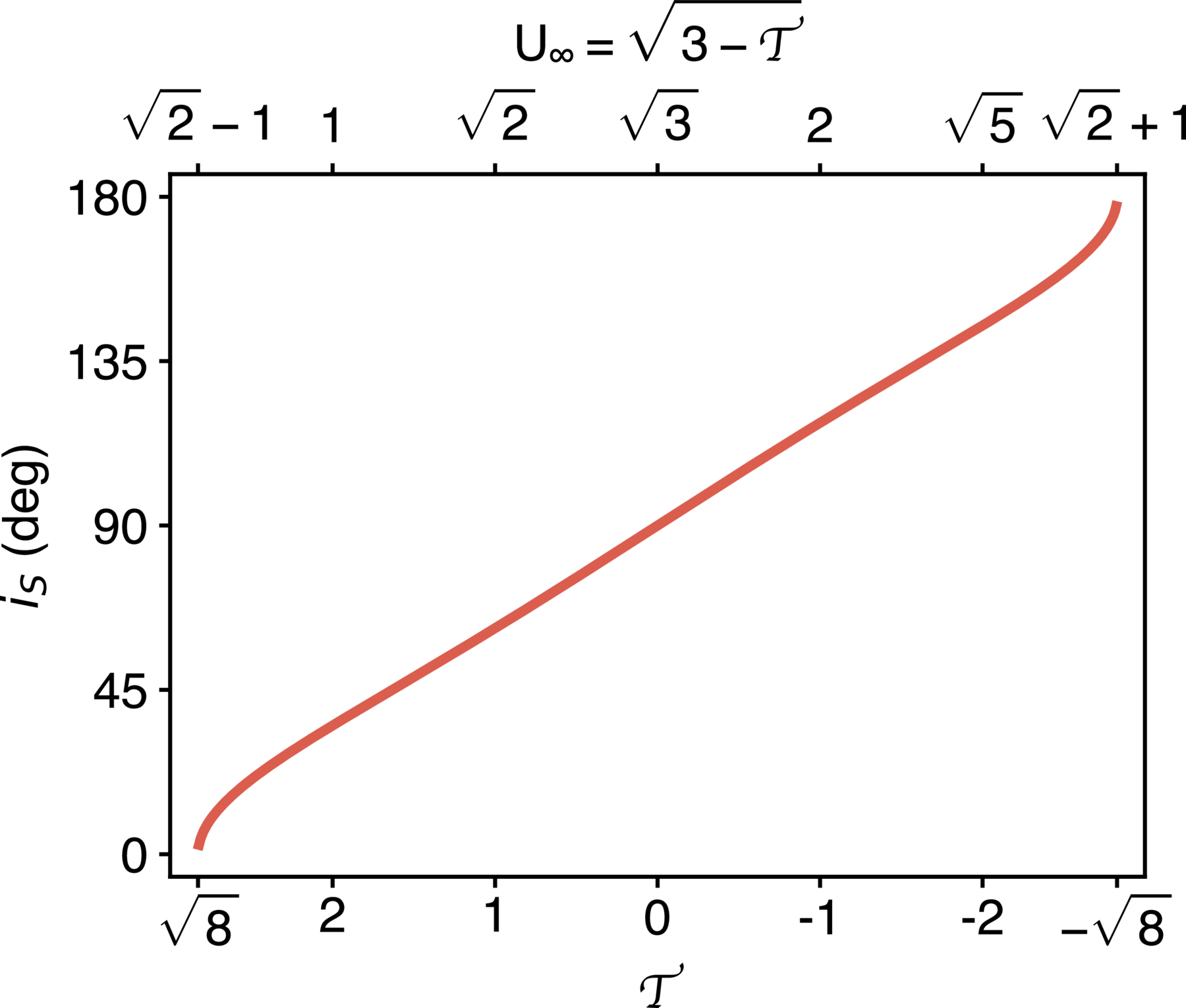 Typical scattering inclination iS as a function of ﹩{ \mathcal T }﹩ (or U∞) when assuming ϕ = 45°. This represents the inclination to which most particles rapidly relax, regardless of their initial inclinations.