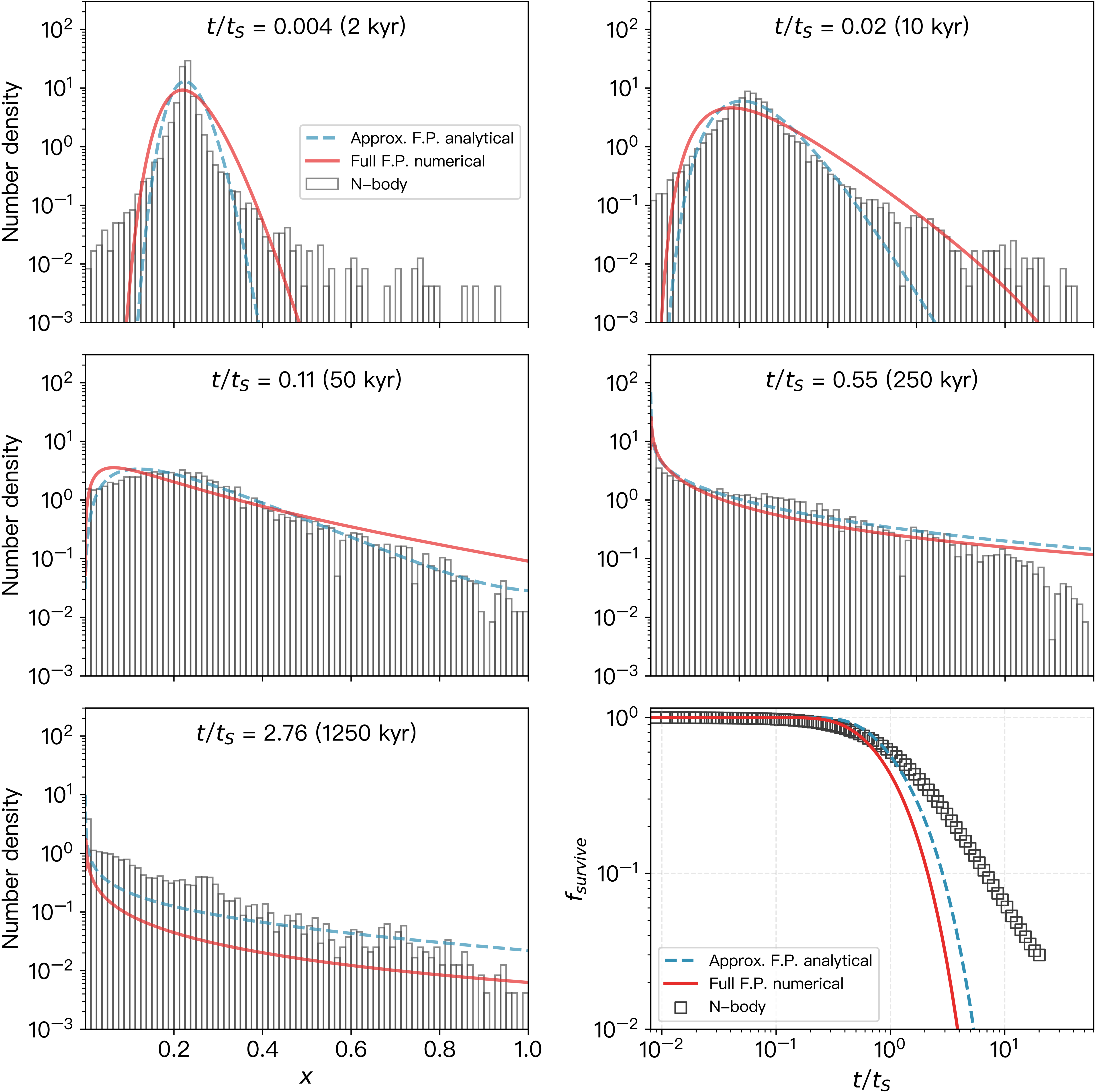 Comparison of the particle energy distribution (x) at various times predicted by the Fokker–Planck equation (solid and dashed curves) and by direct numerical integrations (bar histograms). The blue curves show the analytical solution of the linearized (approximate) Fokker–Planck equation (Equation (49)), while the red curves correspond to the numerical solution of the full Fokker–Planck equation (Equation (46)). Particles are initialized with ﹩{{ \mathcal A }}_{0}=2.49﹩, e0 = 0.634, and i0 = 15﹩\mathop{.}\limits^{\unicode{x000b0}}﹩8, corresponding to U∞ = 0.5 or ﹩{ \mathcal T }=2.75﹩. The planet has mass Mp = 1 × 10−4 at ap = 1 au, and its scattering timescale tS = 450 kyr is computed using Equation (58). The final panel shows the surviving fraction fsurvive as a function of time, with the blue dashed curve given by Equation (51).