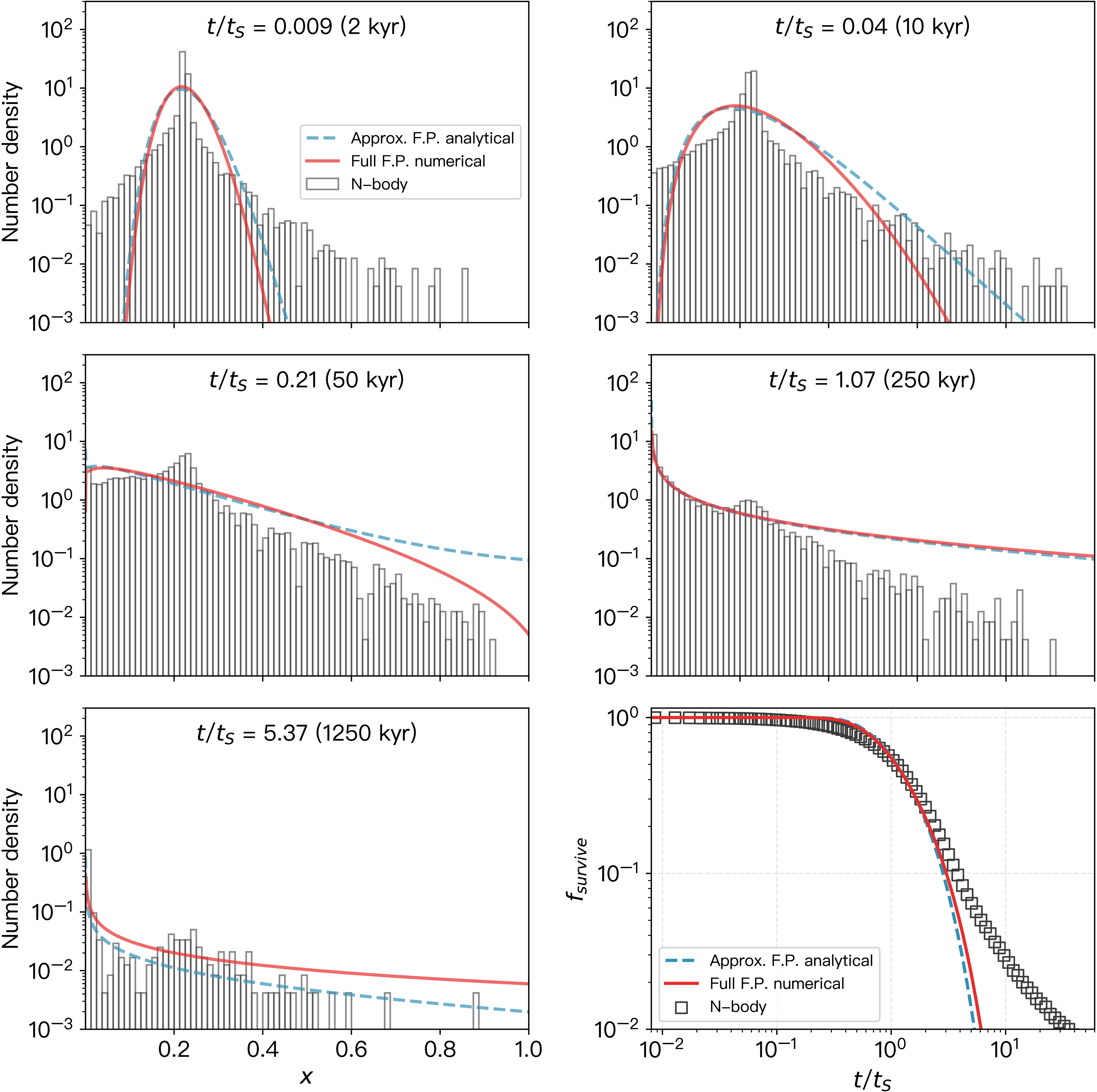Same as Figure 8, but for ﹩{{ \mathcal A }}_{0}=4.47﹩, e0 = 0.871, i0 = 126.2 particles, corresponding to U∞ = 2 or ﹩{ \mathcal T }=-1﹩. The planet has mass Mp = 1 × 10−3 instead, and its scattering timescale tS = 230 kyr.