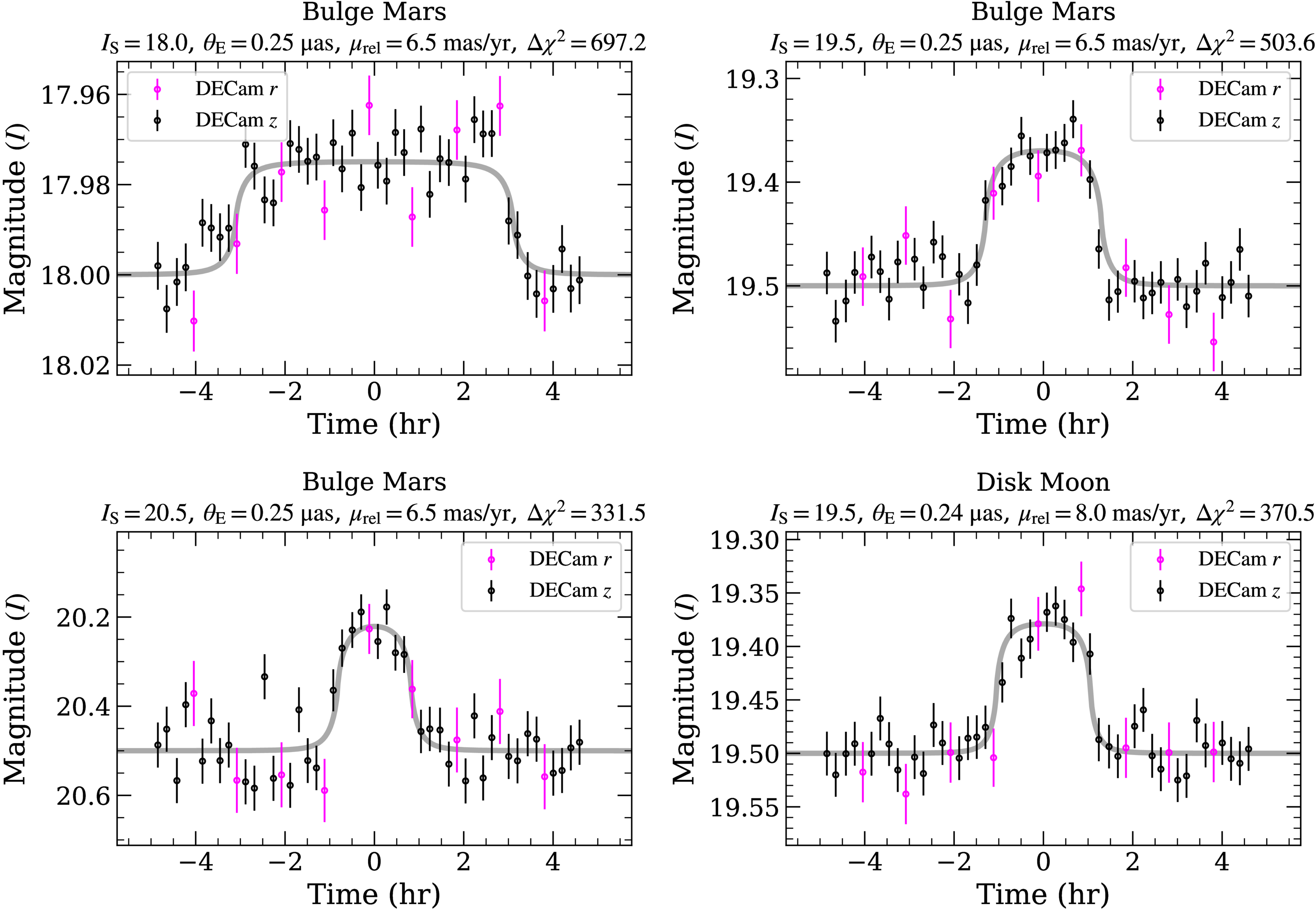 Simulated FFP events as observed by DREAMS. For clarity, data within each observing block are binned (four points in z and three in r per block). Magnitudes are placed on the I-band scale. Lens and source for each panel parameters are summarized in Table 4. Δχ2 denotes the difference in χ2 between a flat model and the best-fit 1L1S model.