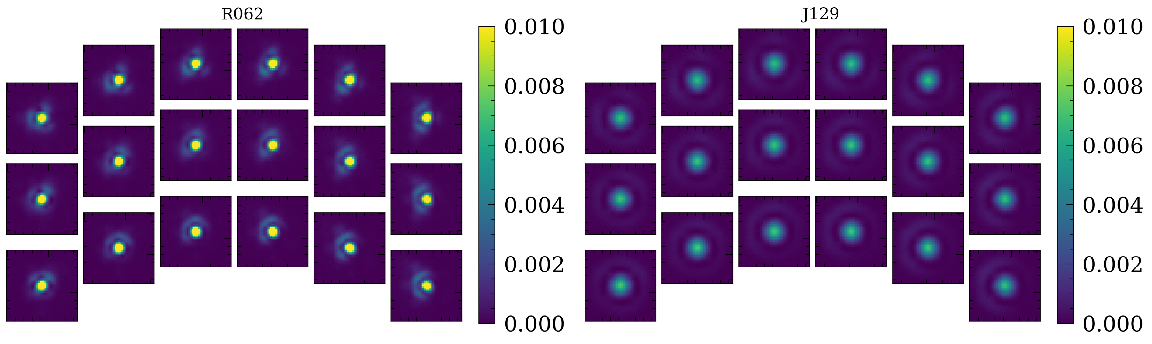 GalSim PSFs, unconvolved with the Roman pixel response, at the center of each SCA. All PSFs are oversampled by a factor of 9. This plot is formatted to reflect Roman’s detector shape and SCA arrangement. Note that for the bottom two rows of the detector, the x-axis is defined such that the origin is at the bottom-right corner of the detectors, and positive x points left (M. A. Troxel et al. 2023).