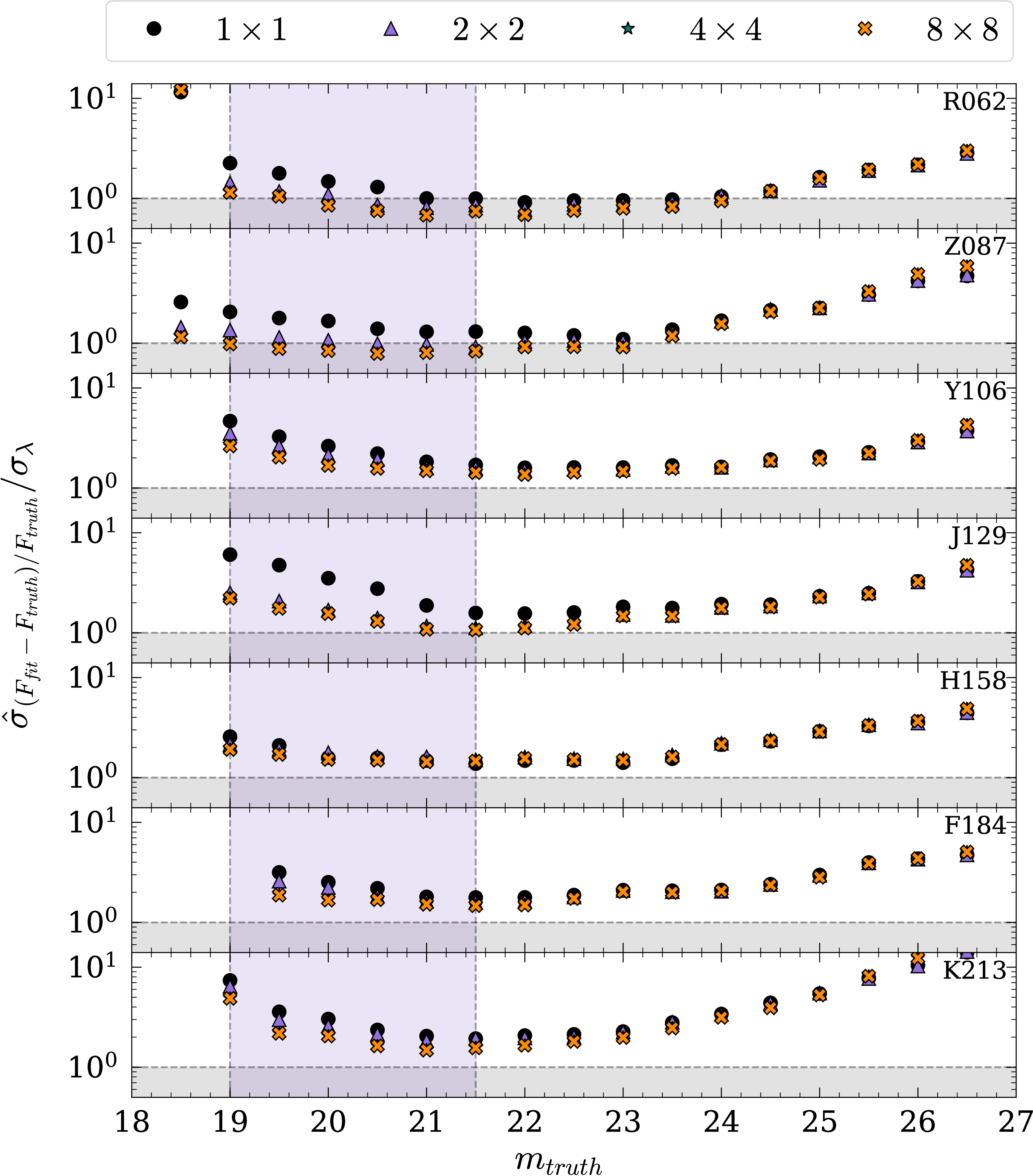 The vertical axis values in Figure 3 divided by Poisson noise (σλ). Each color and marker style represents a different grid size (see legend). The shaded purple region is 19 < mtruth < 21.5, and the shaded gray region is where ﹩\hat{\sigma }/{\sigma }_{\lambda }\geqslant 1﹩.