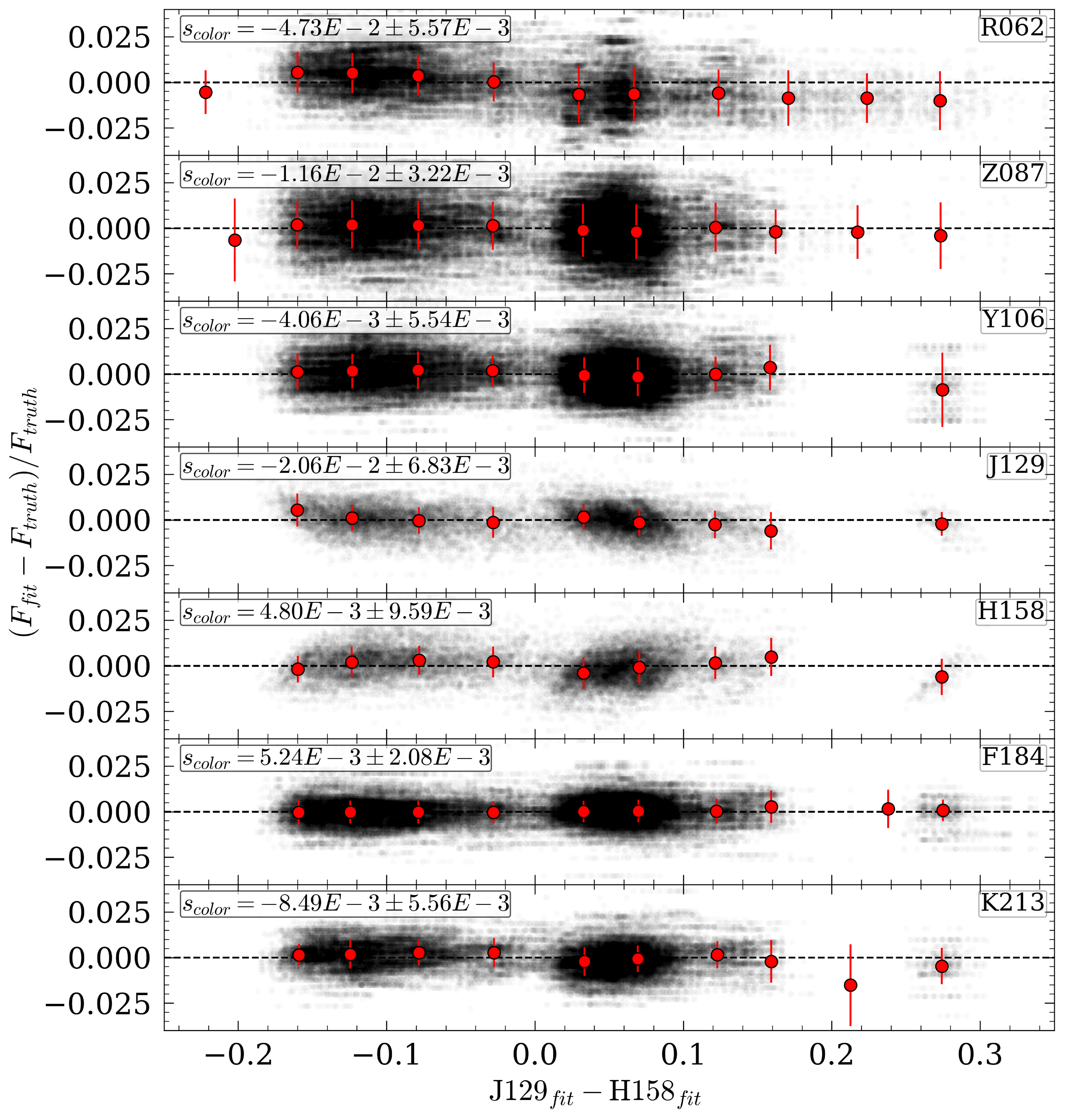 Chromatic dependence of (Ffit − Ftruth)/Ftruth for stars with 19 < mtruth < 21.5. Small black points are individual measurements. Larger red points are the data binned every 0.05 mag, with the position of the red point at the mean of of J129fit − H158fit in that bin. The fit slope of the red points between −0.15 < J129fit − H158fit < 0.15 with its associated error is reported as scolor in the upper-left corner for each panel.