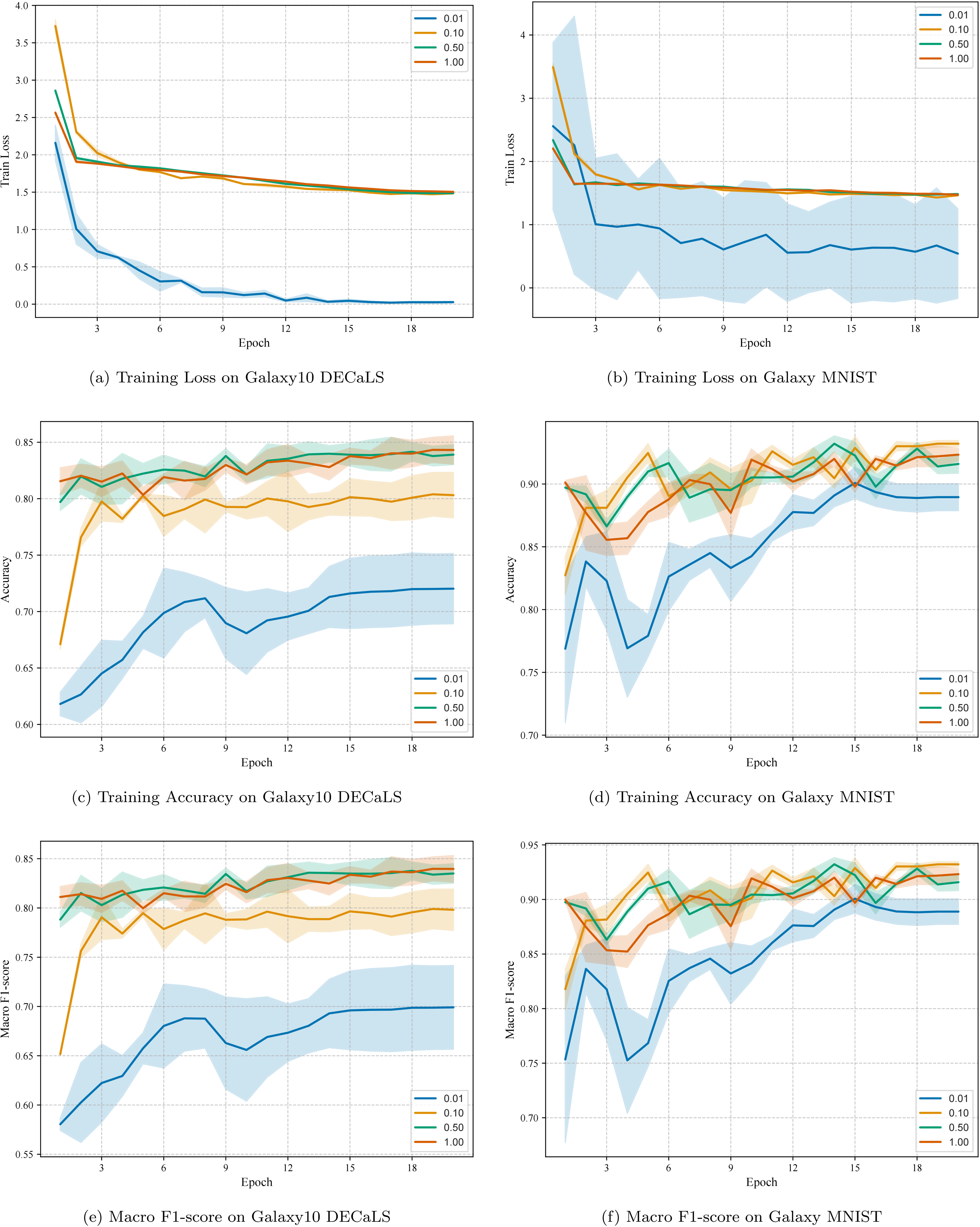 CLIP-GMC training curves for Galaxy10 DECaLS (left column) and Galaxy MNIST (right column) across data fractions of 1%, 10%, 50%, and 100%. Shaded bands indicate ±1σ across five random seeds. (a), (b) Training loss; (c), (d) accuracy; (e), (f) macro F1-score.