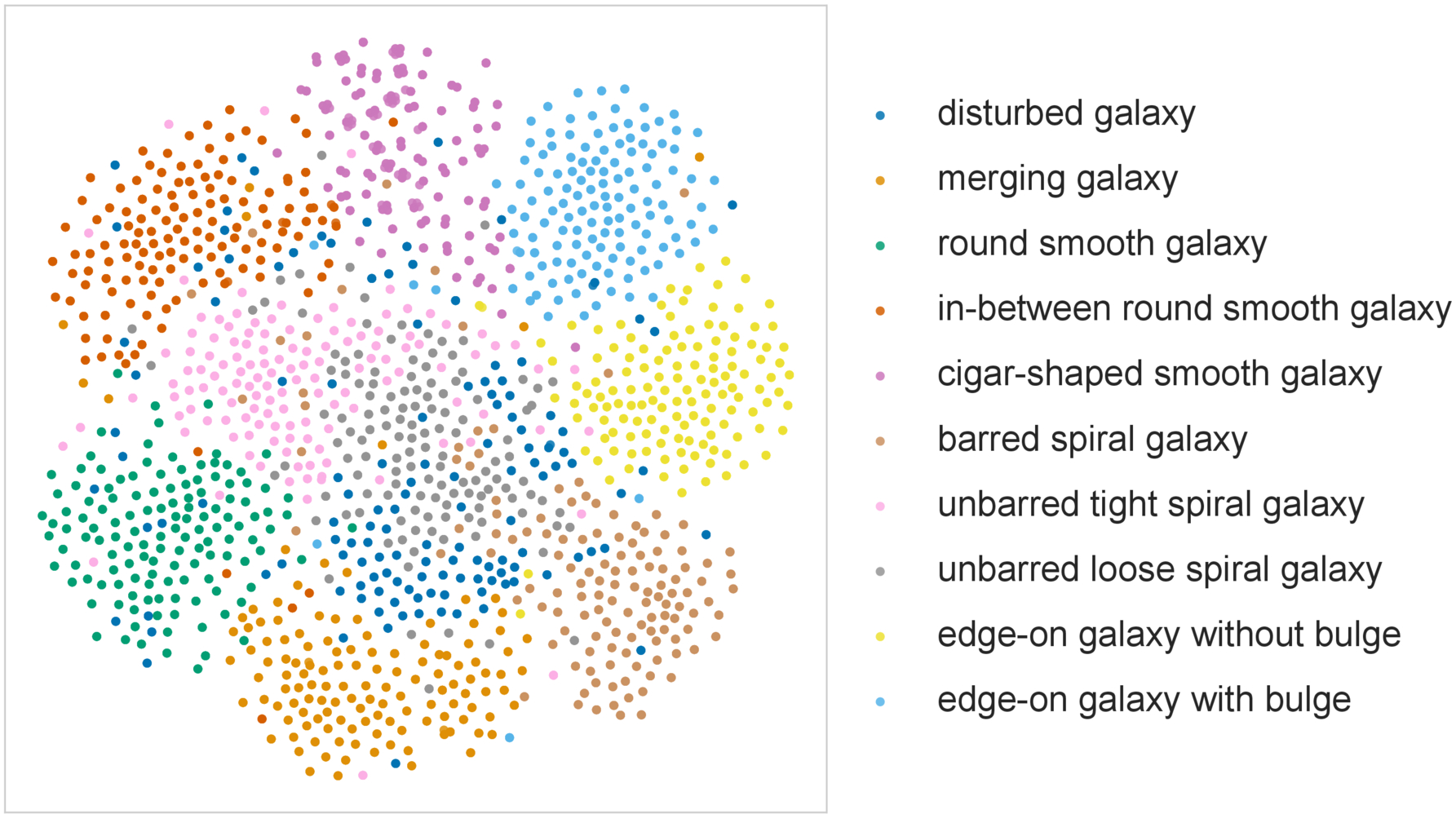 t-SNE visualization of embeddings generated by the CLIP-GMC model, trained on 10% of the Galaxy10 DECaLS dataset.