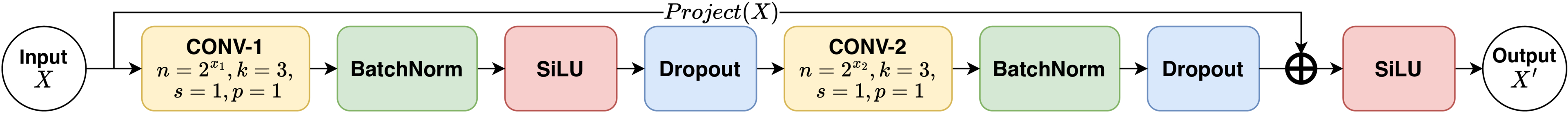 Structure of the convolutional component, consisting of convolutional, batch normalization, activation, and dropout layers, along with a skip connection.
