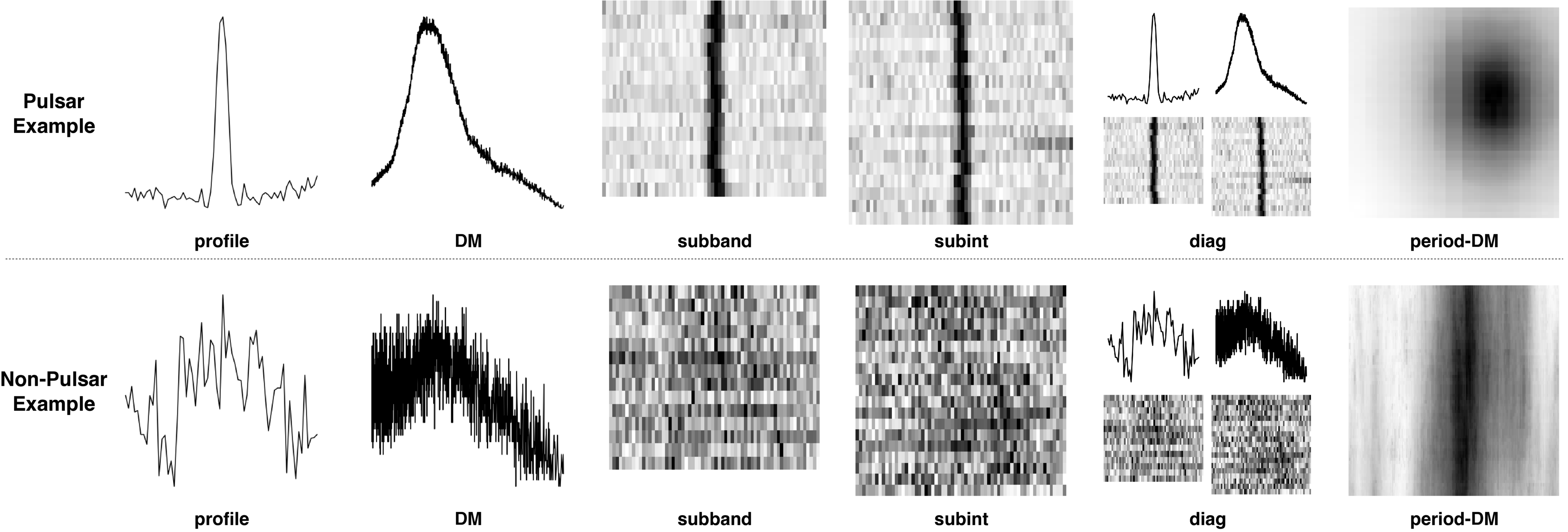 Examples of HTRU data. The top row shows the pulsar samples, and the bottom row shows nonpulsar samples. From left to right: profile, DM-curve, subband plots, subintegration plots, diagnostic plots, and period–DM plots.
