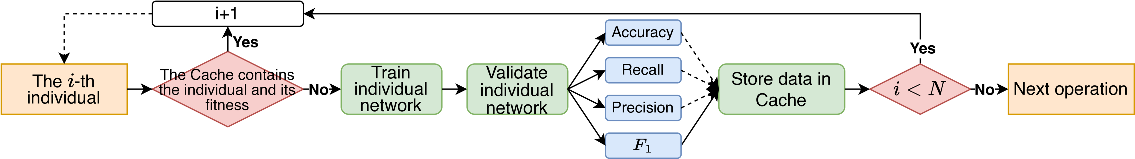 Flowchart of the fitness evaluation process in the GAMMA-CNN framework, where accuracy, precision, and recall are recorded for analysis and the F1 score is used as the fitness metric.