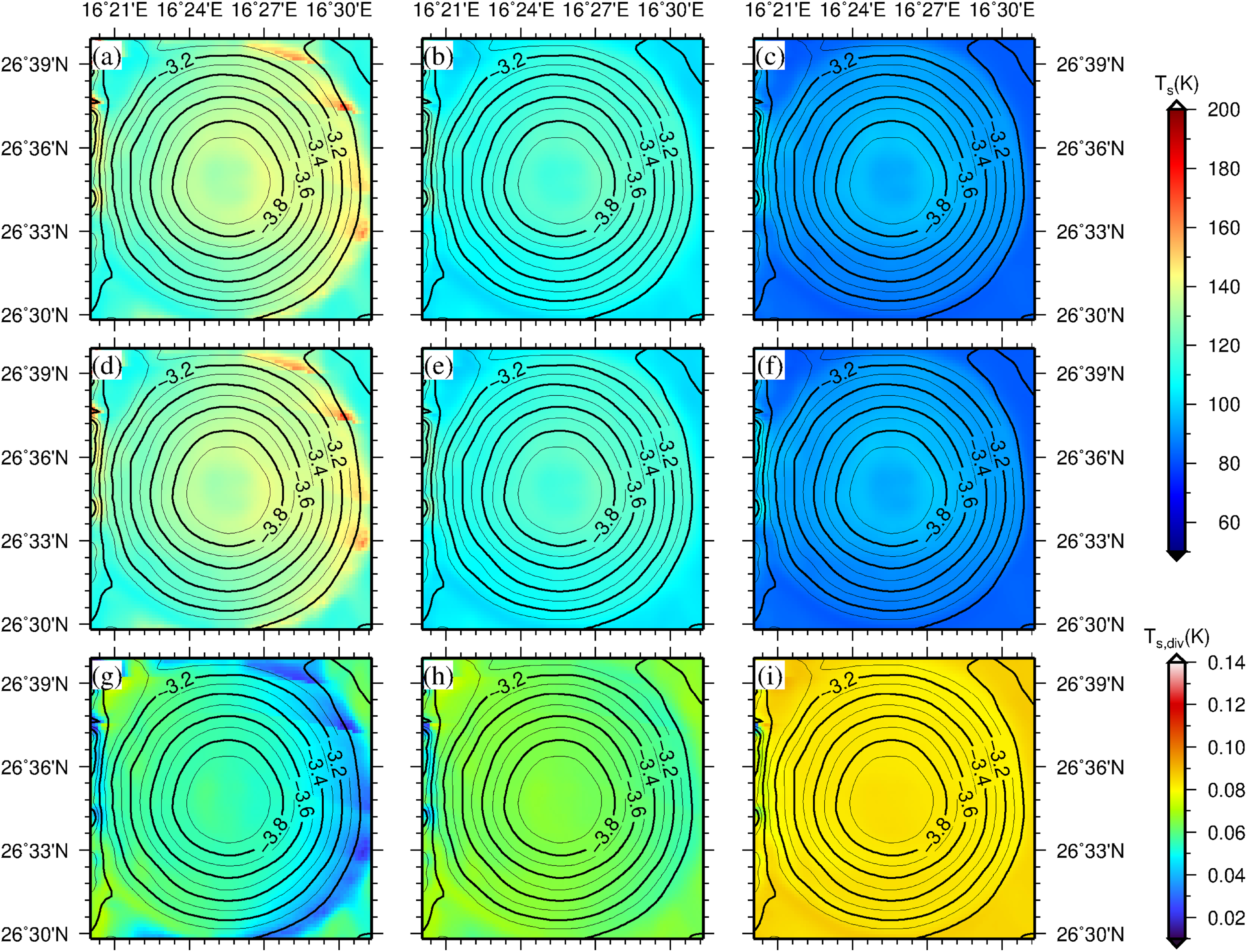 Spatial distribution of regolith temperature Ts at the central location of the study area at different LLTs. Panels (a)–(c) do not consider the effect of SSRTEE, and correspond to LLTs 17.93, 19.567, and 5.89, respectively. Panels (d)–(f) consider SSRTEE, and correspond to the same time points as panels (a)–(c). Panels (g)–(i) presents the temperature differences corresponding to the time pairs (a)–(d), (b)–(e), and (c)–(f), respectively.
