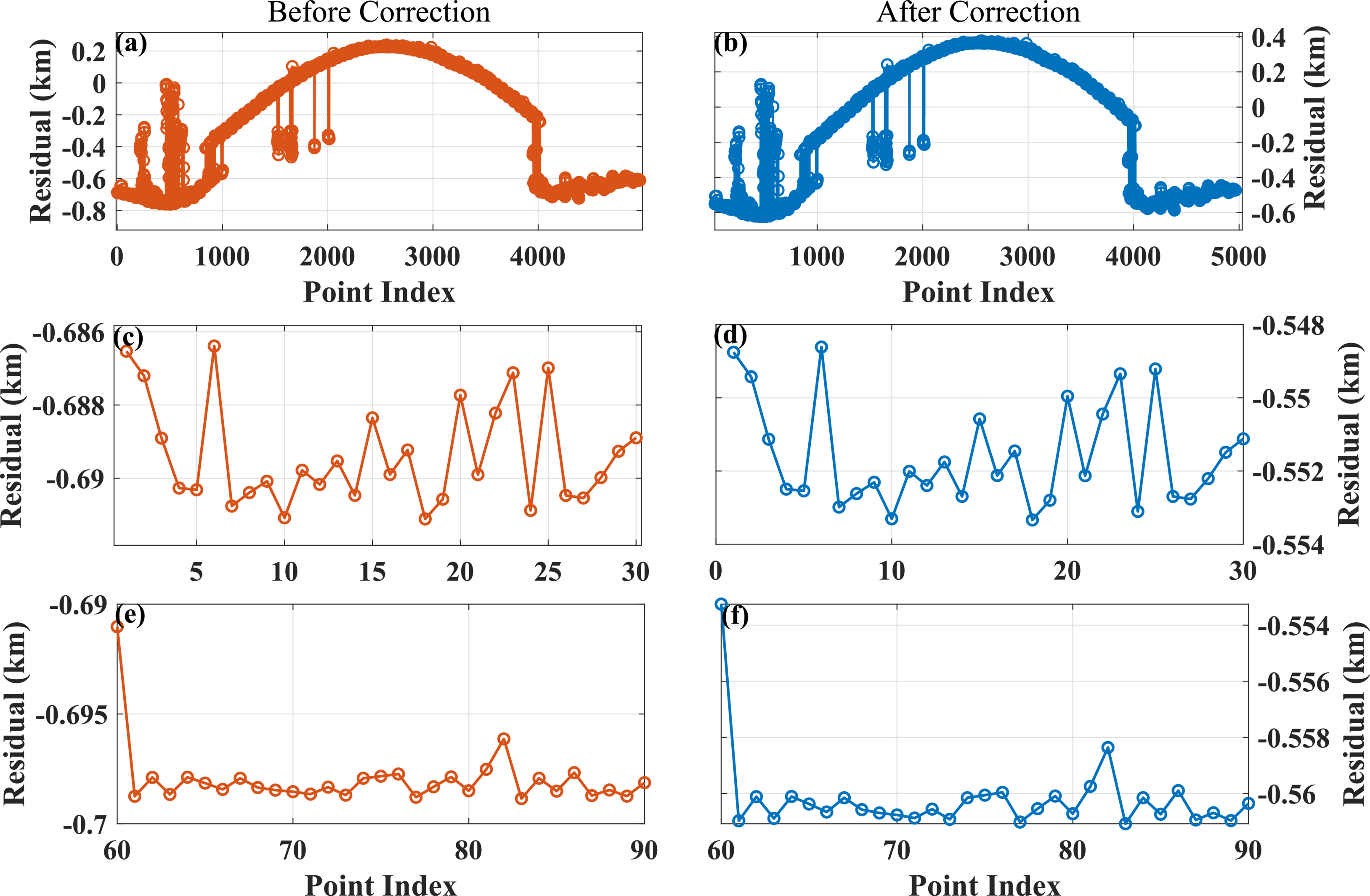 Elevation residual analysis between the DEM constructed from LROC imagery combined with LOLA elevation data and the LOLA measurements. Panels (a)–(b) show the residual distributions for all comparison points, while panels (c)–(f) display the local residual variations for point index ranges 1–30 and 60–90, illustrating the trends before and after correction, respectively.