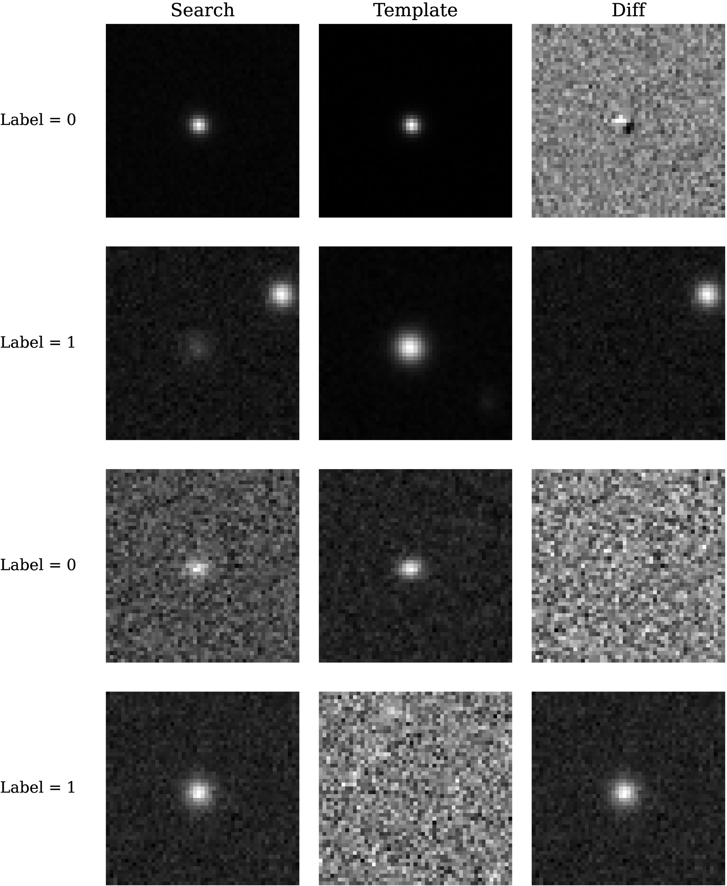 Stamps from the no-Diff dataset. Positive (label = 1) and negative (label = 0) examples are shown. From the top row to the bottom row, we show a bad subtraction negative label, an off-center positive label, a clean subtraction negative label, and a cleanly subtracted positive label, respectively.