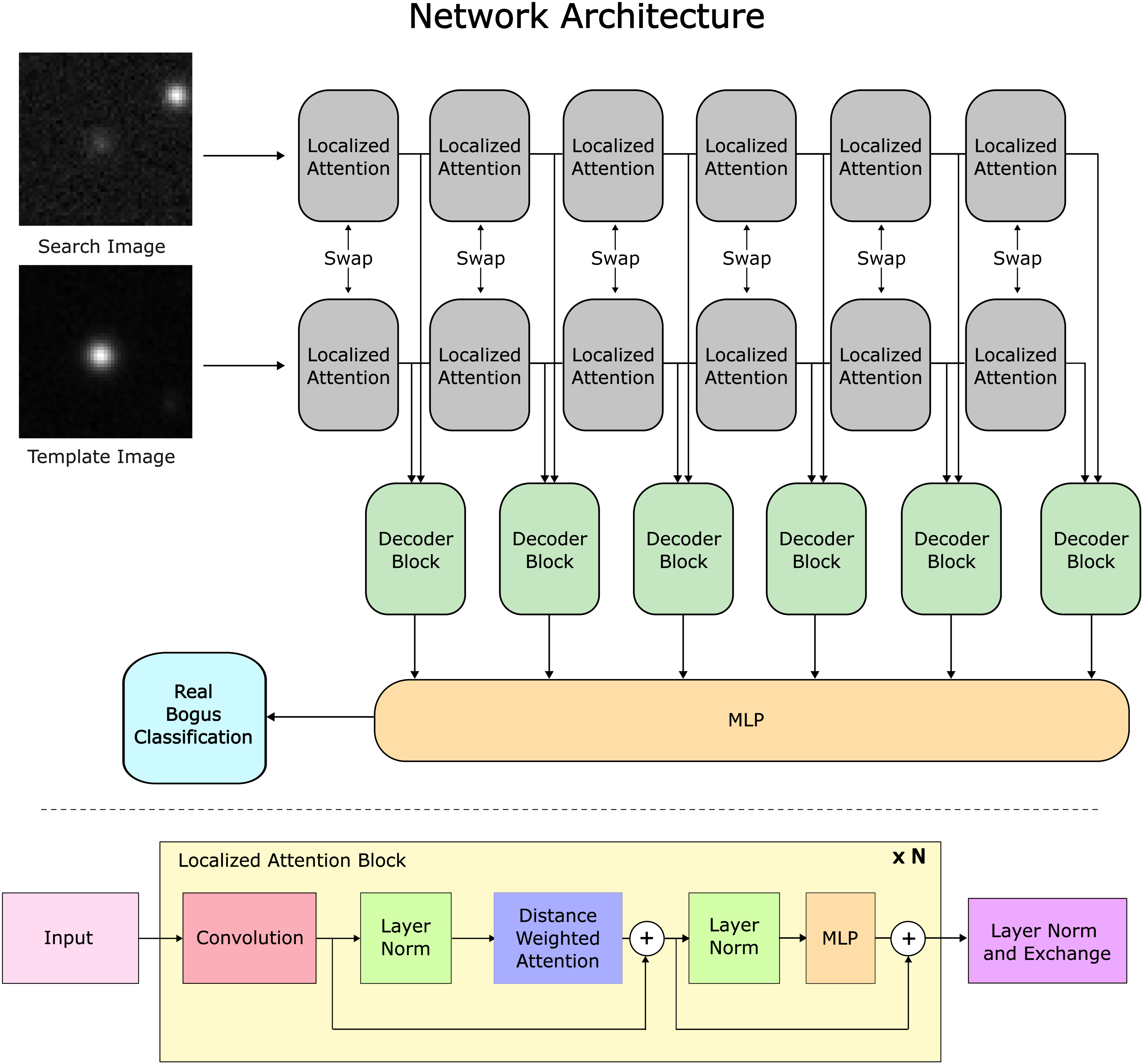 Network architecture of the real–bogus classifier used in this work. (Above) Input images are passed through six localized attention blocks with shared weights to extract salient features. Three distance-weighted localized attention steps are performed in each block. The features are forwarded to decoder blocks and the MLP layer for binary prediction. (Below) Inner working of localized attention modules. In our work, we use N = 3 blocks for each module.