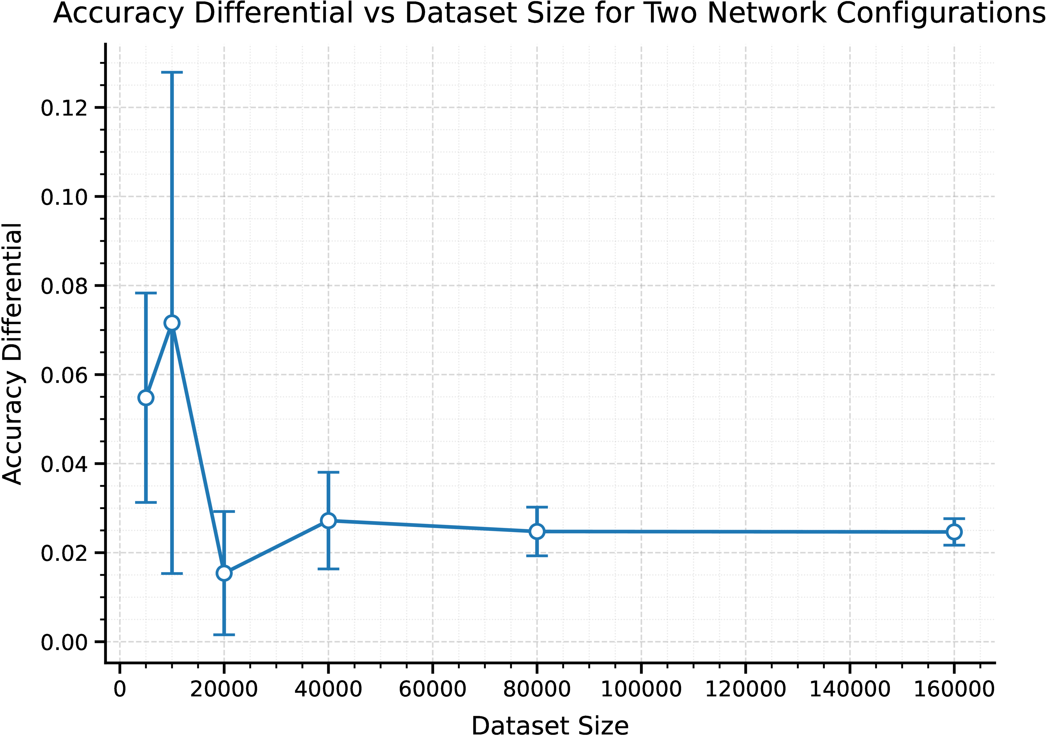 The difference in accuracy between search–template–difference network and search–template network as a function of dataset size for the autoScan dataset after 10 epochs of training.