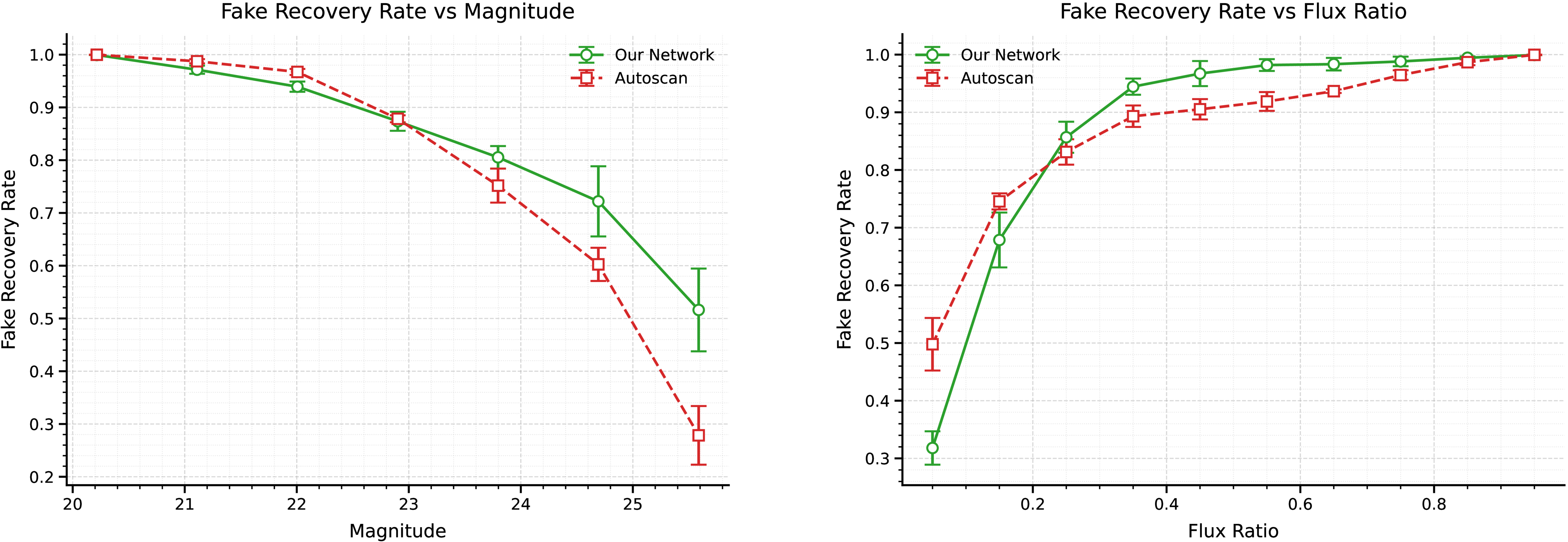 Fake recovery rate (true-positive rate) analysis on the no-Diff dataset. (Left) Fake recovery rate as a function of SN magnitude. Bins with at least 25 samples are shown. (Right) Fake recovery rate as a function of flux ratio. The flux ratio is defined as ﹩\,\rm{clip}\,\left(0,1,\frac{{f}_{d}}{{f}_{t}+{f}_{sn}}\right)﹩, where fd and ft are fluxes of 5 by 5 center grids centered on the SN in the difference and template images, respectively.