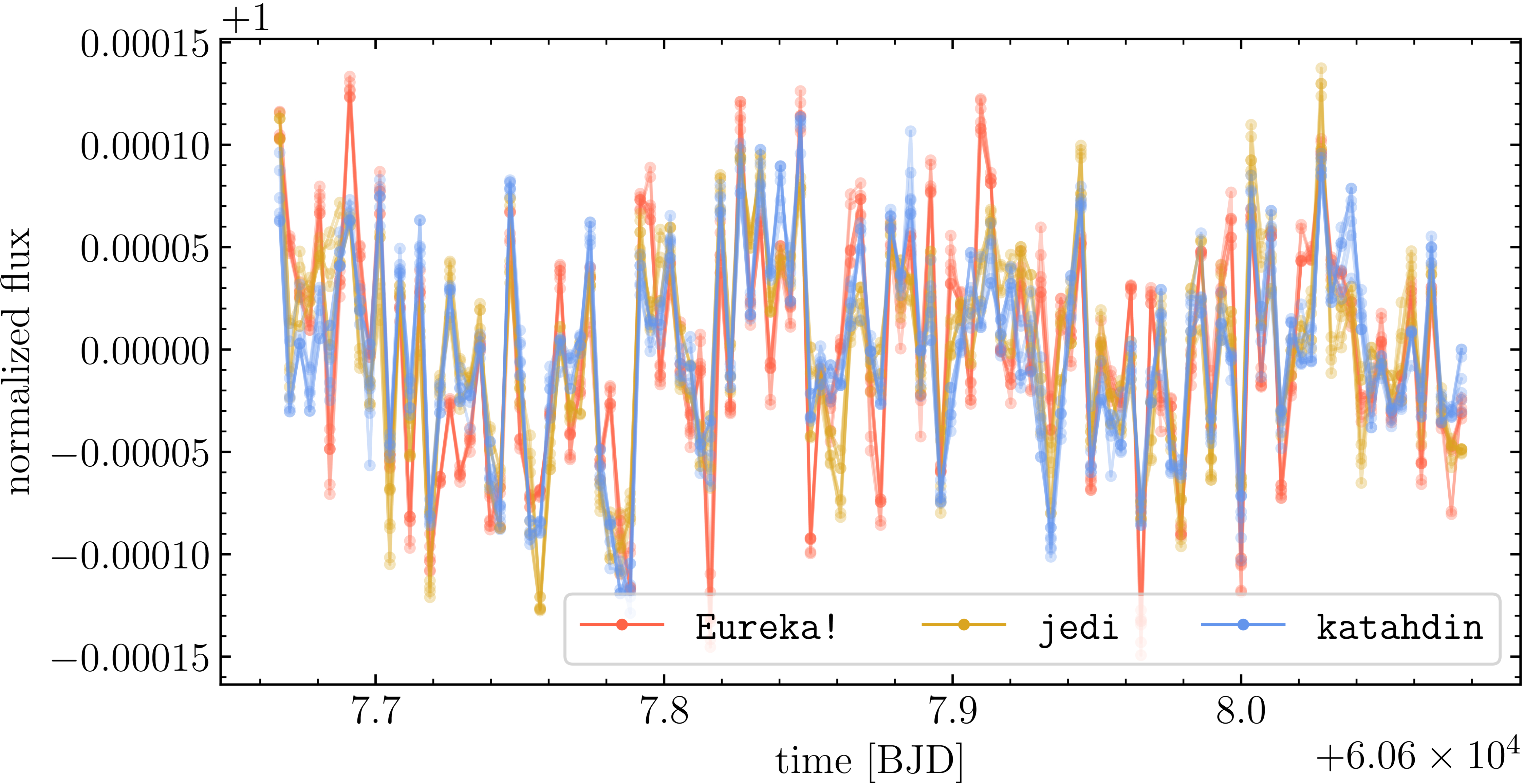 A zoomed-in view of exposure 1 for all 18 5 minutes light curves after dividing out the best-fit quadratic trend from each. Note that all reductions tend to agree on the overall structure of the time series, and that reductions derived from the same pipeline tend to agree with each other.