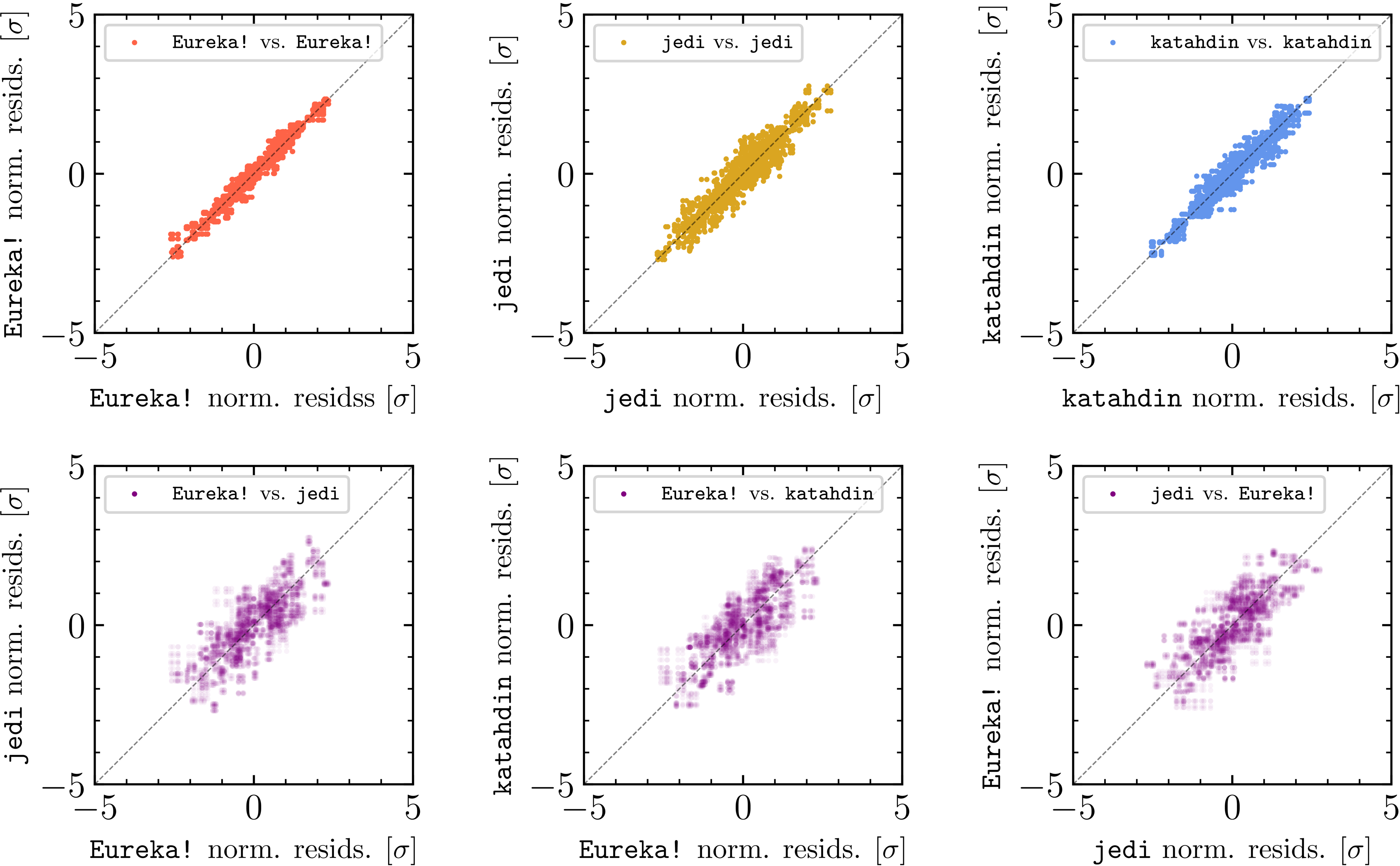 Correlations between the different light curves plotted in Figure 2. Each point represents a comparison between two different reductions at a single data point; the panels in the top row are limited to comparisons between reductions that used different settings of the same underlying pipeline, while the panels in the bottom row show comparisons between reductions created with different pipelines. As noted, the three pipelines tend to agree, and light curves derived from the same pipeline using different settings are even more strongly correlated.