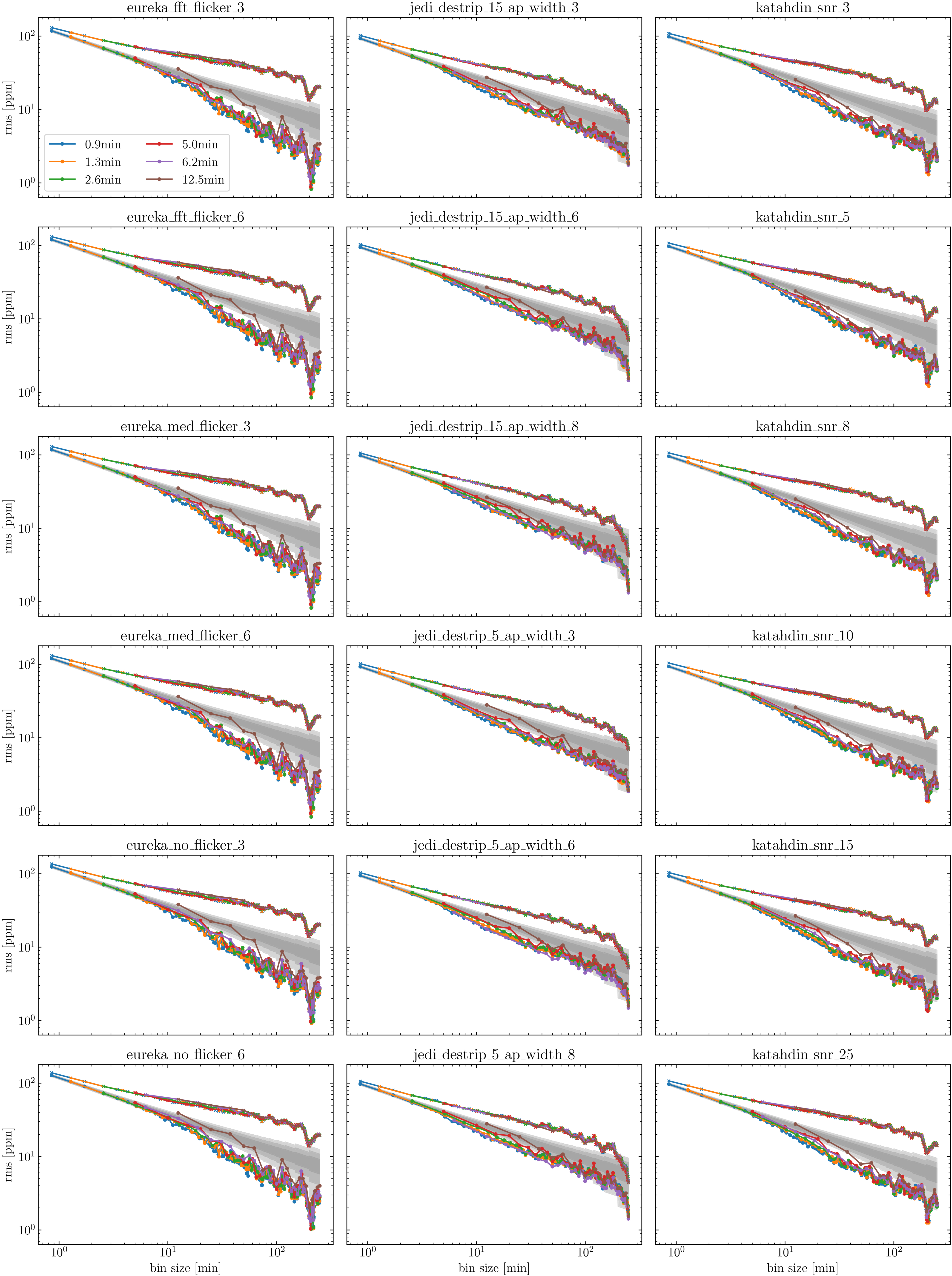 Bin size vs. rms plots for a subset of the best-fitting models from our grid. This displays one line for every fit that used an exponential trend and quadratic limb darkening, then either an Matérn 3/2 kernel (dots) or no overlying GP (crosses). The 1σ, 2σ, and 3σ contours for expected ﹩\sqrt{N}﹩ binning are shown via gray contours. We see that the residuals of the GP fits consistently bin down faster than white noise after the bin size exceeds roughly 10 minutes, but that the no-GP fits immediately diverge from white noise behavior. We also note that the cadence the fit was performed on does not seem to influence residual binning behavior.