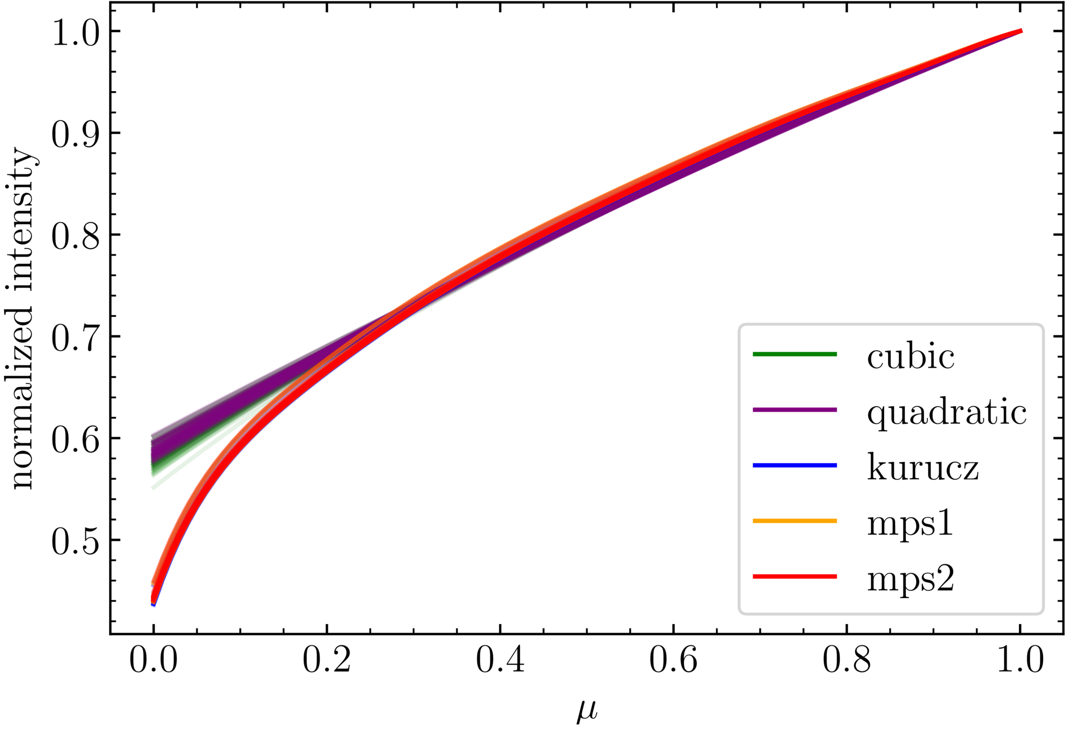 The MLE limb-darkening profiles for all models using an exponential trend and a Matérn 3/2 GP kernel. Note that all three of the physical models stack on top of one another, while the quadratic and cubic models agree with each other and prefer a gentler curve on the limb.
