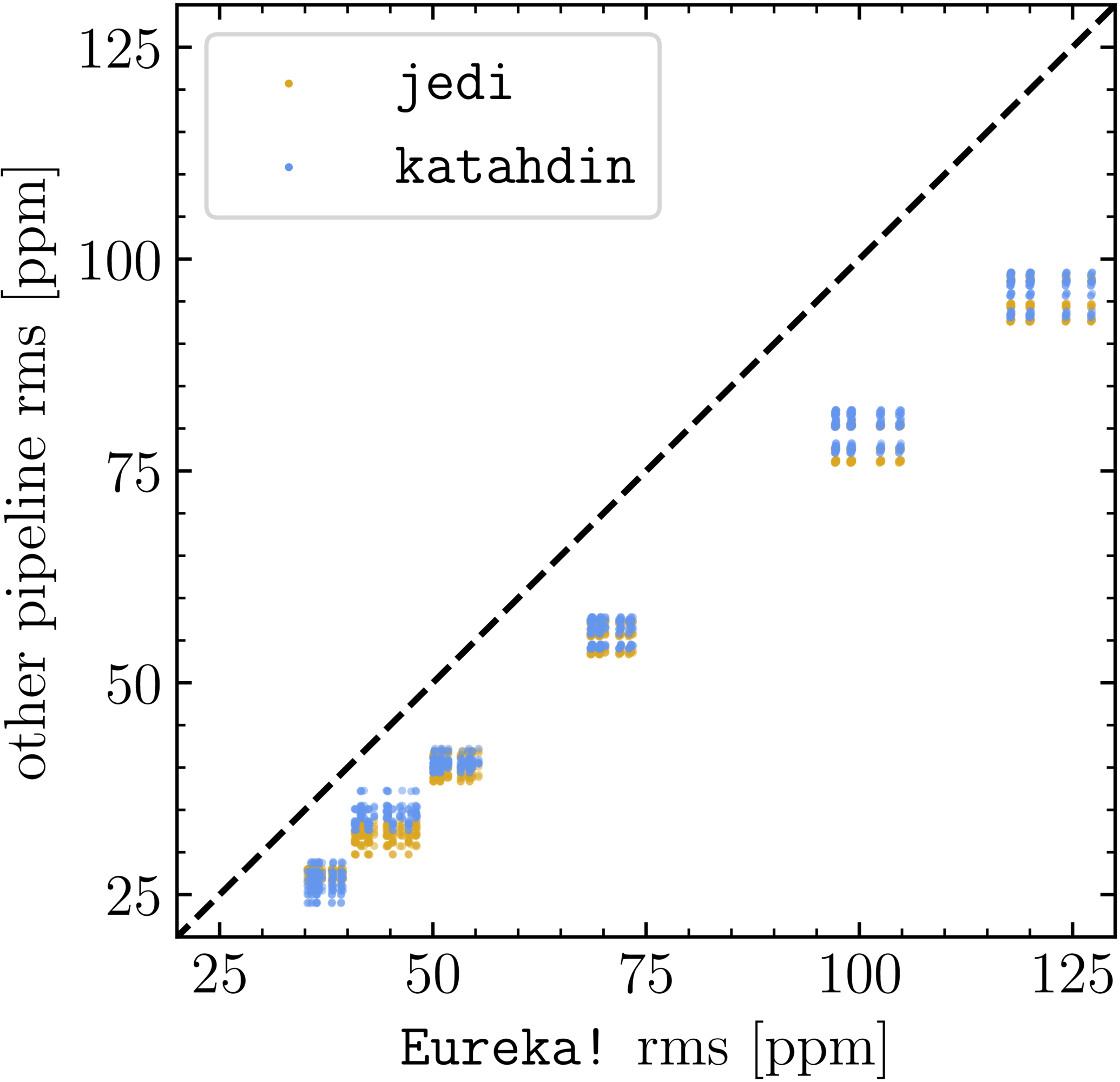 Comparison between the rms of the residuals for fits that used the Eureka! pipeline and fits that used either ExoTiC-JEDI or katahdin. Each point represents a like-for-like comparison where every modeling choice is the same (cadence, trend type, GP kernel, etc.) except for the reduction used.